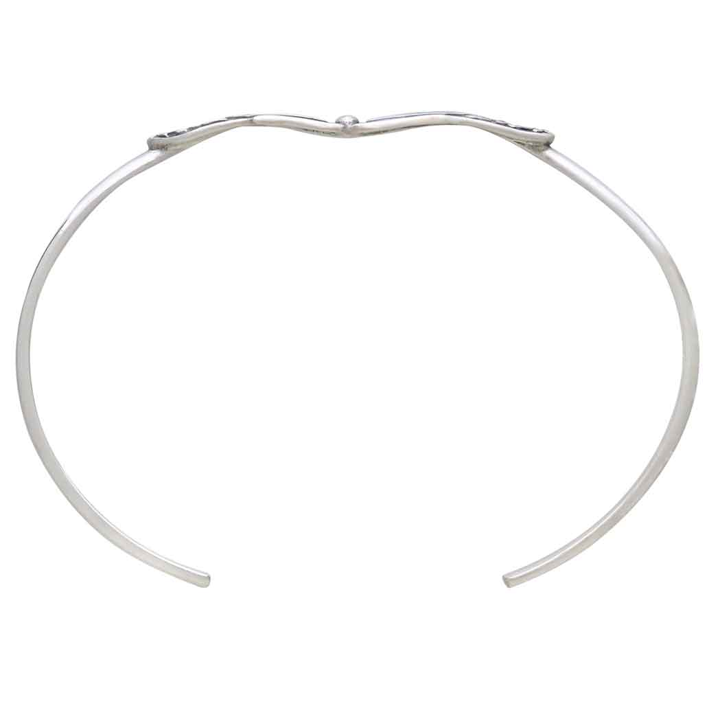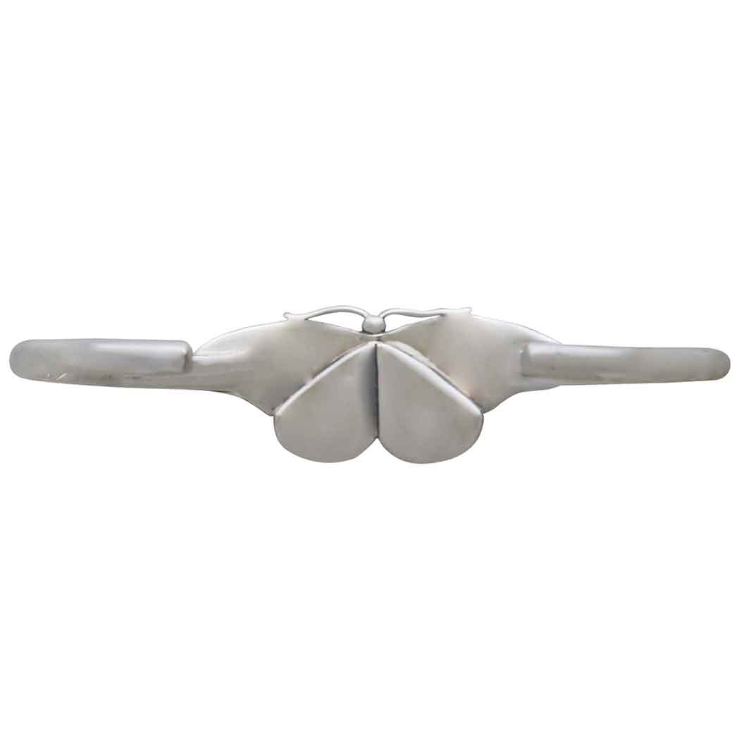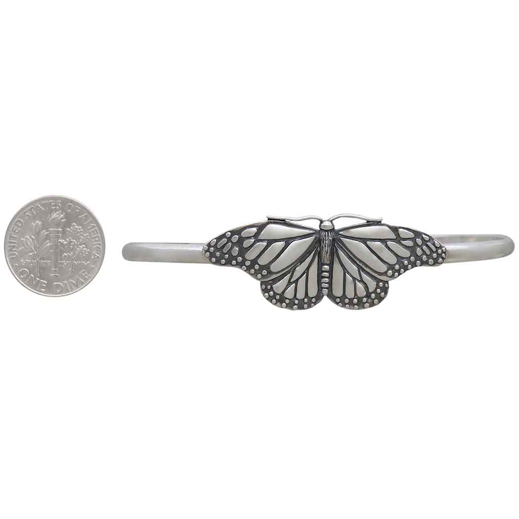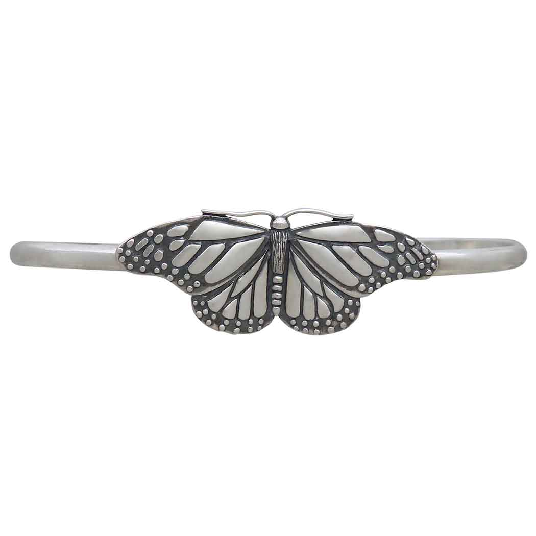 Wear this sterling silver monarch butterfly cuff bracelet to honor the queen of butterflies, symbolizing beauty, strength, endurance, trust and evolution. We marvel at her grace as she flutters by. understanding she's at the end of a miraculous migrational journey. We celebrate the monarch's arrival, and ponder how she's at her most beautiful later in life. This butterfly bracelet delights with its gently curved wings, delicate texturing, and long antennae. Find more Bracelets to add to your shop and more Finished Jewelry to round out your collection.
