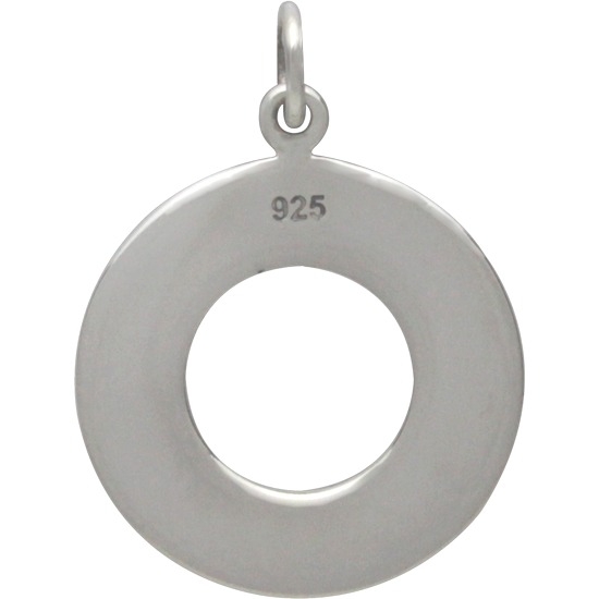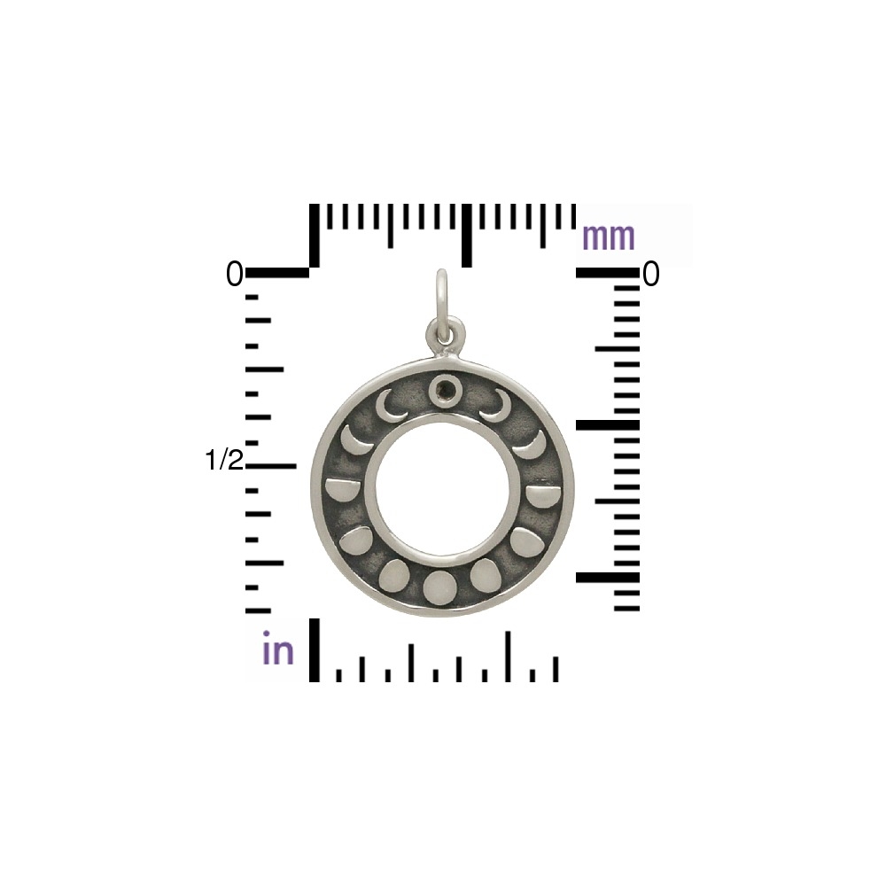 This etched and oxidized celestial jewelry charm represents all of the lunar phases as the moon waxes and wanes. The center is a cut out circle, as if it were representing a lunar eclipse, as the different profiles of the moon form a ring around the center from New Moon to Full Moon. Each phase of the moon has its own associated meaning. New moons are for beginnings, for example, while the waning moon is believed to be a good time for banishing things, or clearing negative influences. Channel the meaningful phases of our lovely lunar orb with this beautiful moon charm... while creating jewelry designs that are out of this world!
