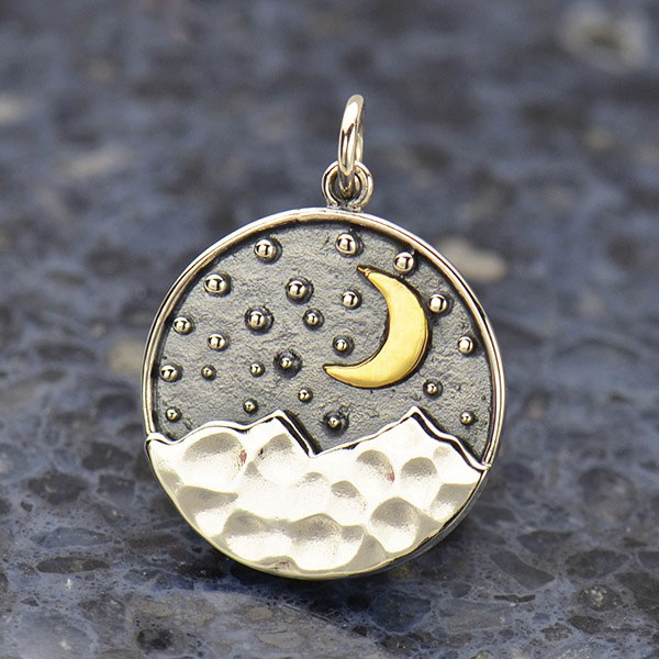 Sterling Silver Mountain Pendant with Bronze Moon. This handmade, mixed metal pendant features a hammered finish mountain range, granulation dots on an oxidized background and a bronze moon. Let this nature inspired piece remind you of your favorite place to star gaze. Oxidized detailing and granulated dots give this piece dimension, enhancing the jagged mountain tops. Whether you like to ski, hike, or go camping, this fun piece will help you remember that cool, fresh mountain air! Shop for more Travel inspired Charms and Pendants.
