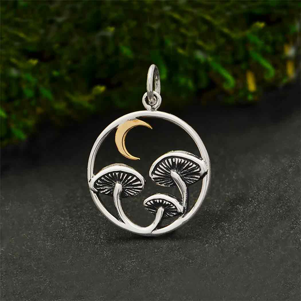 This magical mushroom charm with a bronze moon will transport you to a far away land where anything can happen. Featuring three beautifully detailed sterling silver mushrooms in a circle frame with the warmth of the bronze moon above. Its fairy tale qualities are truly delightful. Makes a great gift for avid readers, and imaginative creatives in your life.