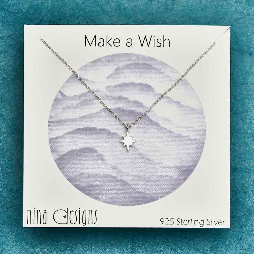 This north star charm necklace will arrive displayed on a 3 inch square card, printed with "Make a Wish" and in a cellophane bag.