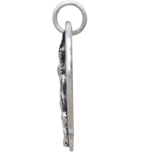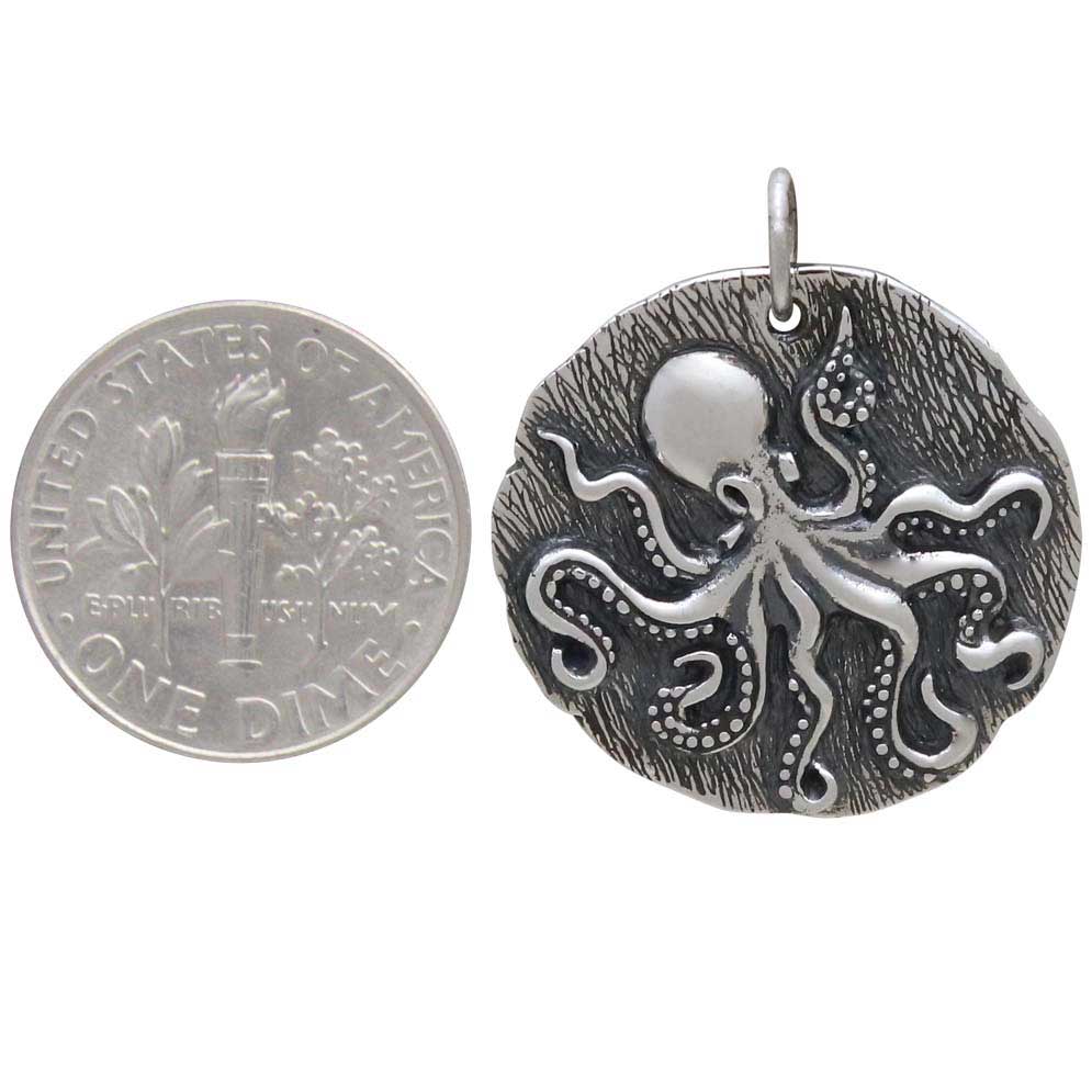 No beach jewelry line would be complete without this sterling silver octopus coin pendant. With her eight spiraling tentacles flowing around her, this graceful octopus seems to float through a seaweed forest. The octopus is born into a watery realm. And, like the water itself she is ever changing, shifting, and hypnotically wafting under the push and pull of the moon. To survive she's become a master of camouflage, notoriously fluid, intuitive and regenerative. The shape-shifting octopus reminds us nothing is as it seems. Beyond our physical plane there is a vast realm imbued with subtle wonder and shimmery brilliance. Make the octopus your talisman, and take a peek behind this veil of reality for yourself.