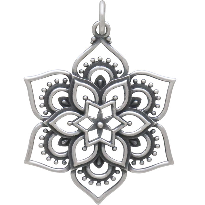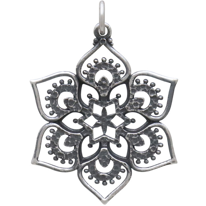 Consider this sterling silver openwork lotus mandala a symbol of wholeness, meditation, and healing. In this many petaled flower charm, the lotus becomes a mandala - a visually appealing, overlapping, geometric form that helps quiet chattering thoughts, appeasing the spirit. From its center to its rim, this mandala's symmetry and beauty is exquisite.