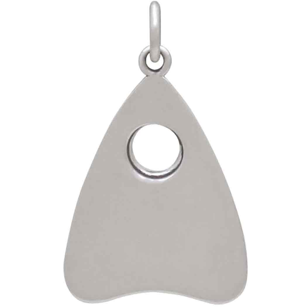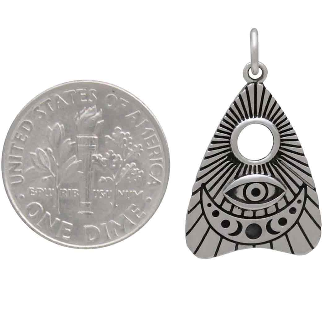 Those fascinated with the occult will be delighted by this sterling silver Ouija planchette charm with all-seeing eye. It features details you might find on the real thing, like moon phases, the hole for selecting letters, and an all-seeing eye.
