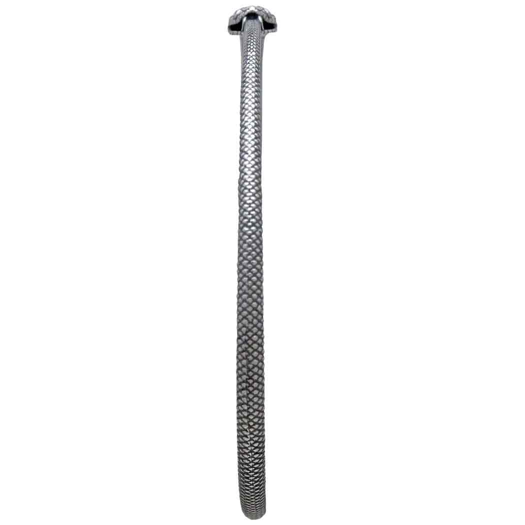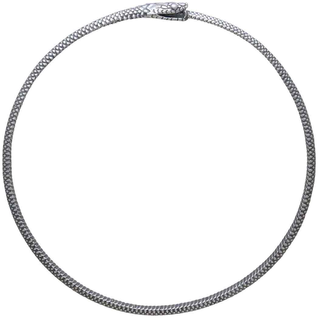 The entire surface of this sterling silver ouroboros bangle bracelet features lovely texturing resembling snake skin. At one point along the bracelet you will find the head of the snake complete with fangs eating it's own tail.