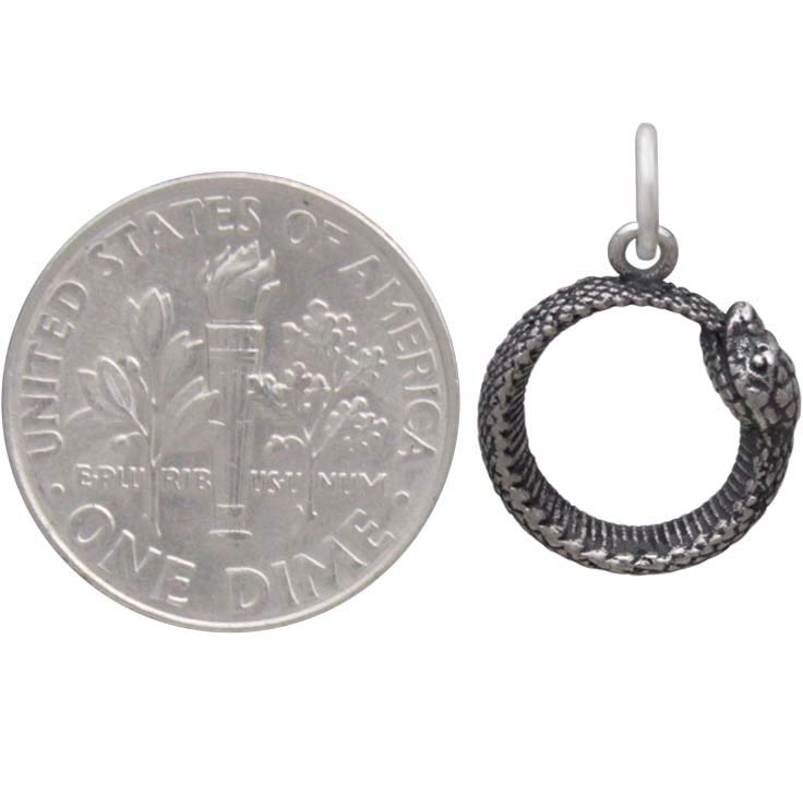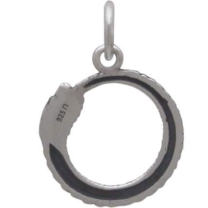 Add magic & mystery to your jewelry line with this sterling silver ouroboros snake charm. The ouroboros - the serpent eating its own tail - speaks to the cyclic nature of the universe; that creation begins after destruction, and life springs forth from death. It is humanity's never ending story, and our place within it. A powerful symbol of endless return, the ouroboros gives us all hope.