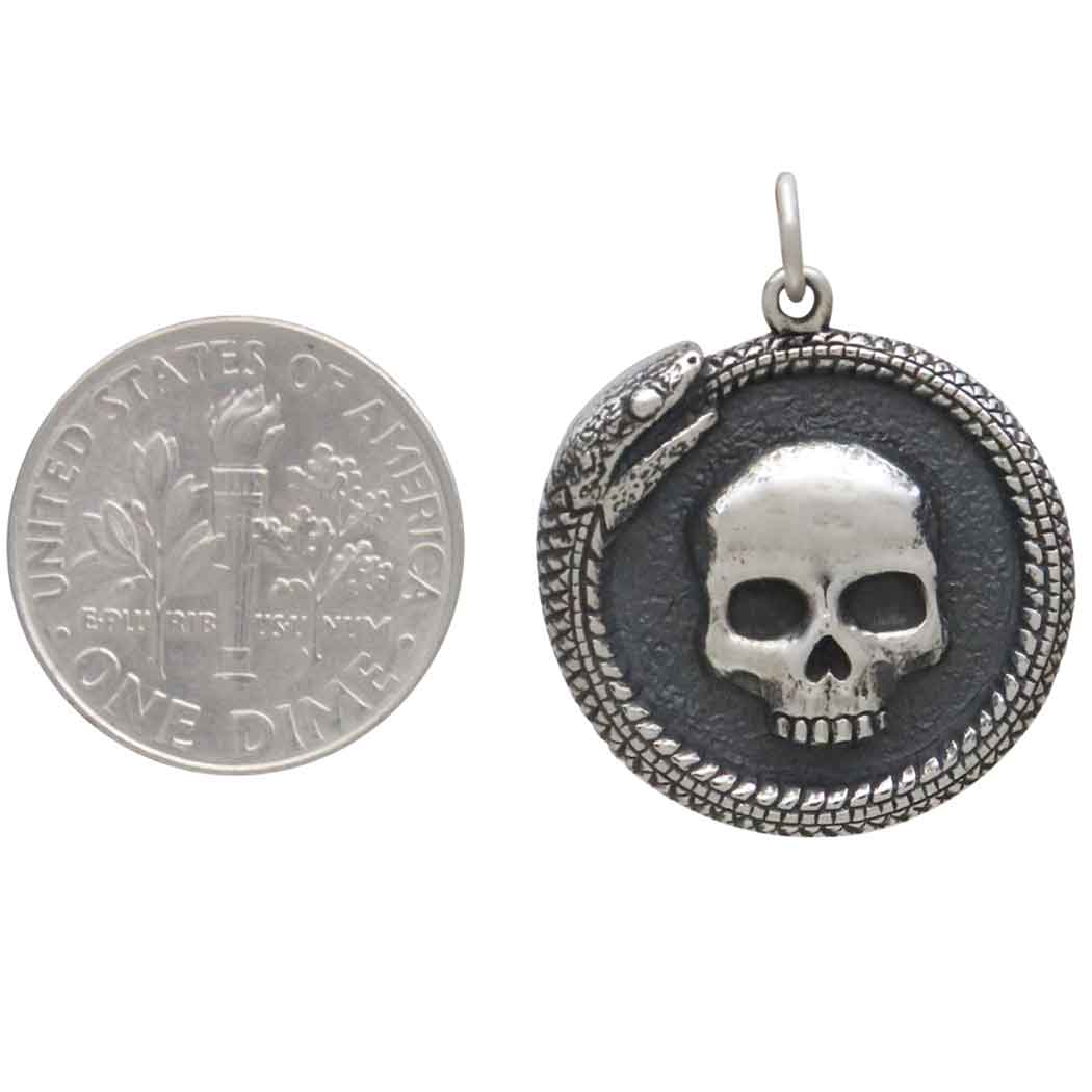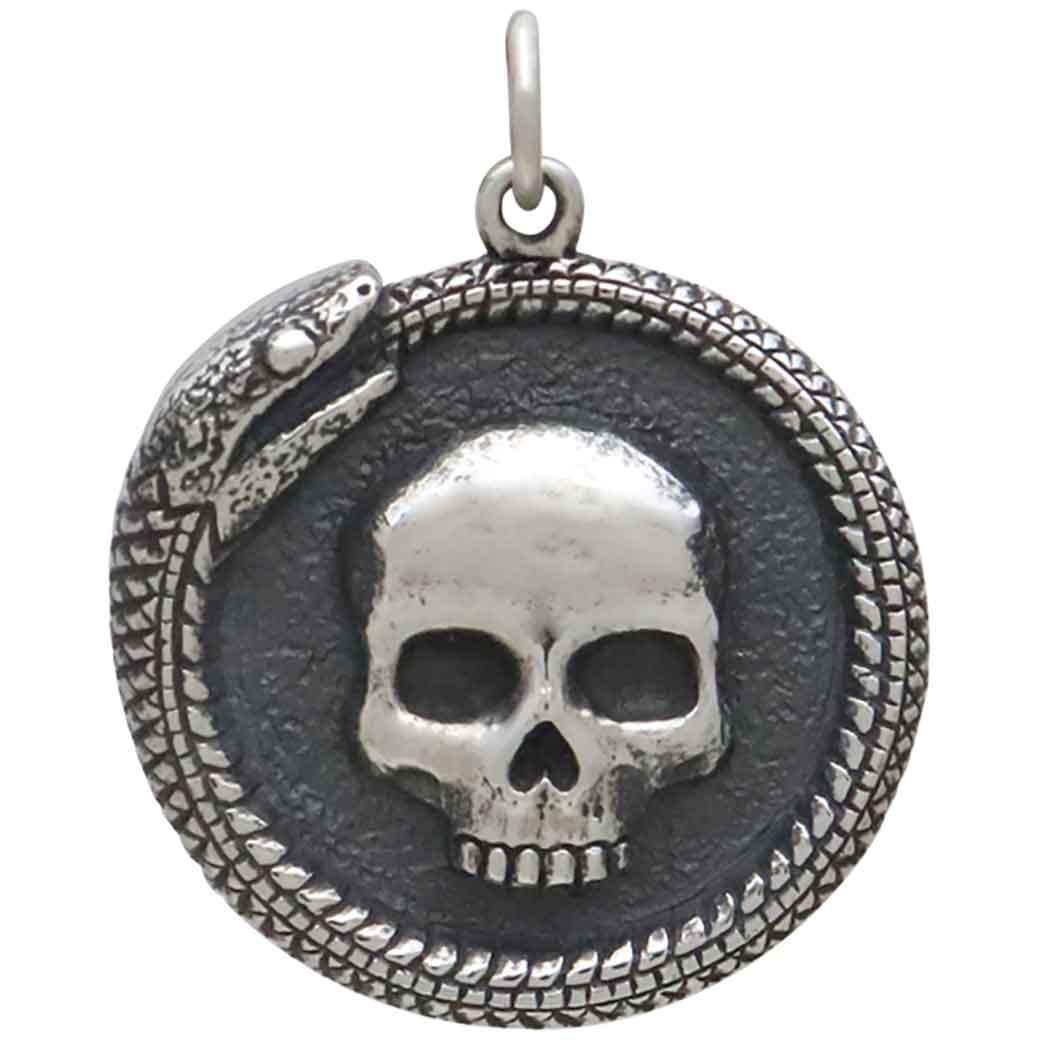 In this sterling silver talisman charm, we married two compelling images - the ouroboros with a skull. The skull serves as a poignant reminder that life is fleeting. And, the ouroboros - the serpent eating its own tail - speaks to the cyclic nature of the universe; that creation begins after destruction, and life springs forth from death. It is humanity's never ending story, and our place within it. A powerful symbol of endless return, the ouroboros gives us all hope.