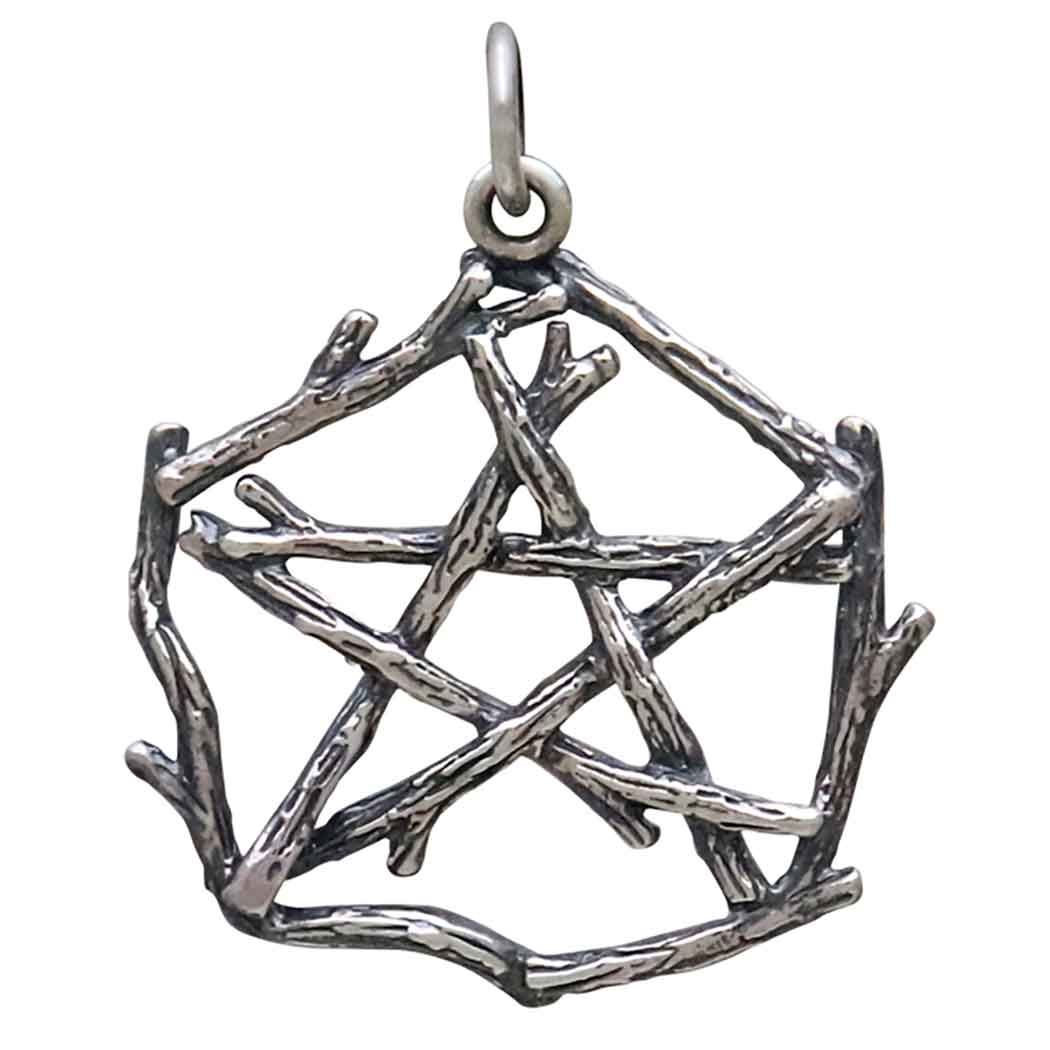 Invoke protection and ancient magic with this sterling silver pentagram charm, artfully crafted from textured branches. Each point of the five-pointed star represents the classical elements—earth, air, fire, water, and spirit—united in perfect harmony. The organic branch detailing gives this piece a natural, forest-born aesthetic, perfect for witches, druids, and lovers of nature-based symbolism.