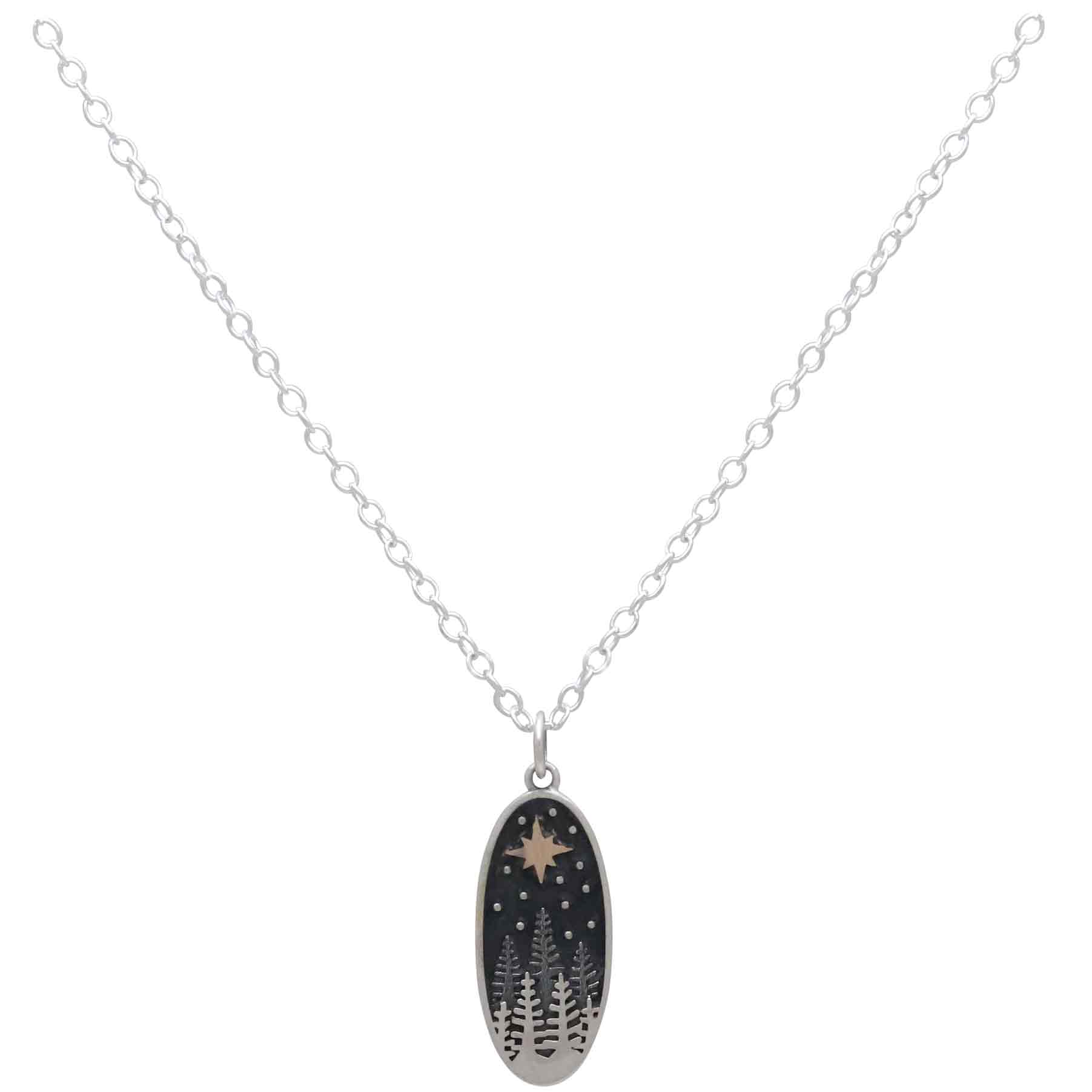 There's so much to love about this sterling silver pine tree necklace with bronze star. The dark night sky is dotted with stars casting their glow upon a forest full of mystery. All this captured within an oval frame to delight your customers who look to your shop for Travel Jewelry that honors the forests, mountains, and oceans. Perfect for eco-conscious jewelry lines.