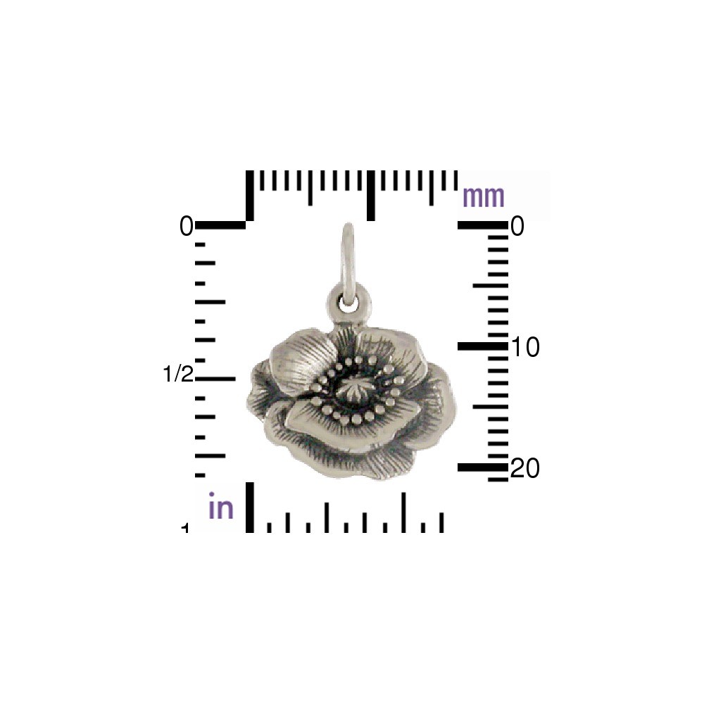 Sterling Silver Vintage Inspired Poppy Flower Charm. This beautiful poppy is one of the few flower charms we offer that is wider than it is long. It is a fresh perspective that really works. Pair with all your chubby gemstone beads.