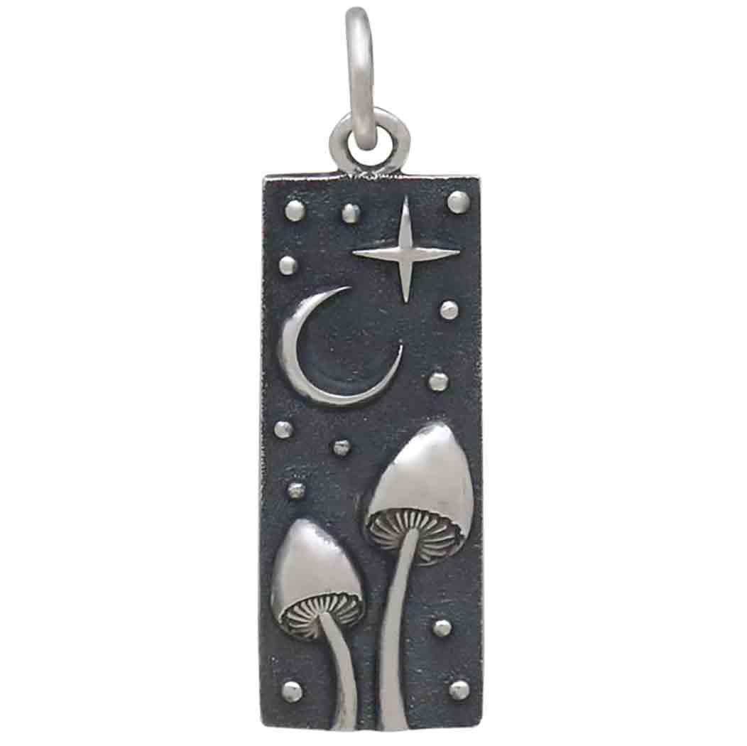 This sterling silver rectangle mushrooms and moon charm presents two wee mushrooms sprouting up in the night, working their magic and mystery upon the universe while we sleep. Celebrate mushrooms in your jewelry line as decomposers, umami flavor, and for pyschedelic properties.