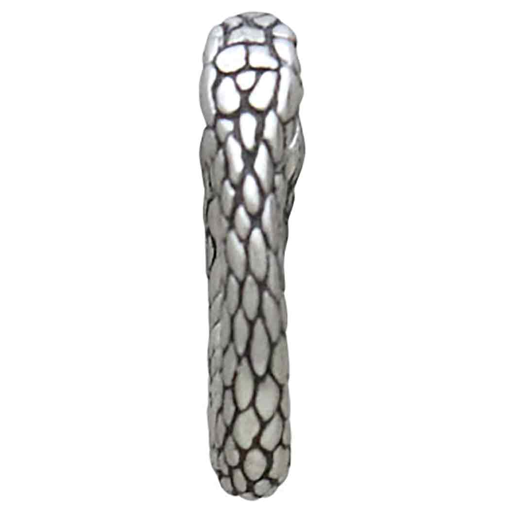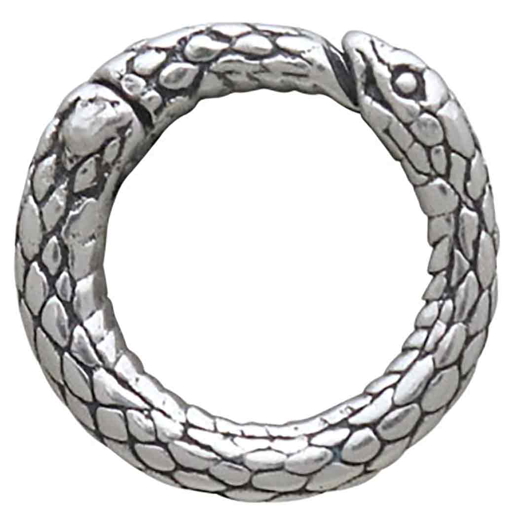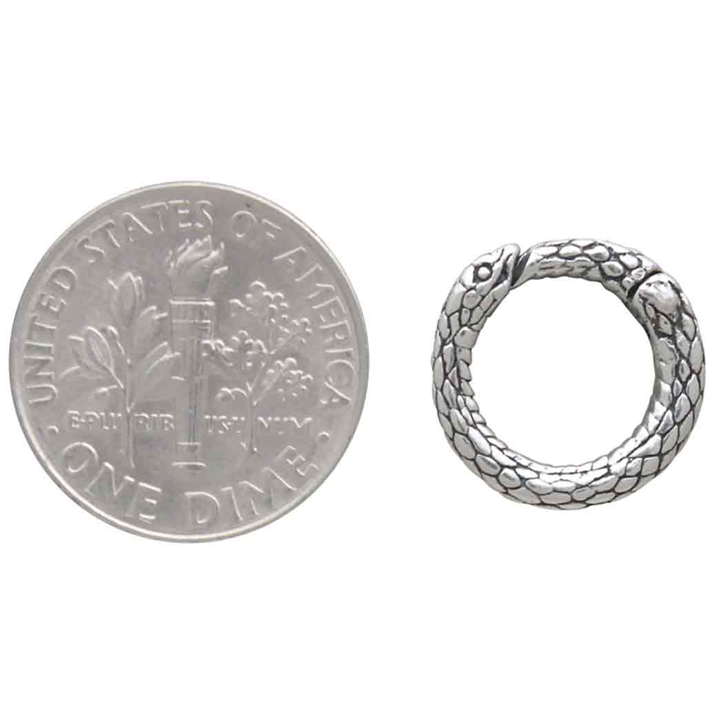 Offer your customers versatility with this sterling silver ouroboros removable charm holder link. Featuring the timeless Ouroboros symbol, a serpent eating its tail, representing cycles, unity, and eternal renewal. The charm holder's exceptional detail includes a mesmerizing snakeskin texture and scaly under belly, adding an extra layer of sophistication to its design. Add up to two or three charms at a time, and clip onto the chain of your choice. Change your selections whenever the mood strikes. If you like to switch up your charms daily, this bail is for you. Shop for more Pendant Bails and Mini Charms!