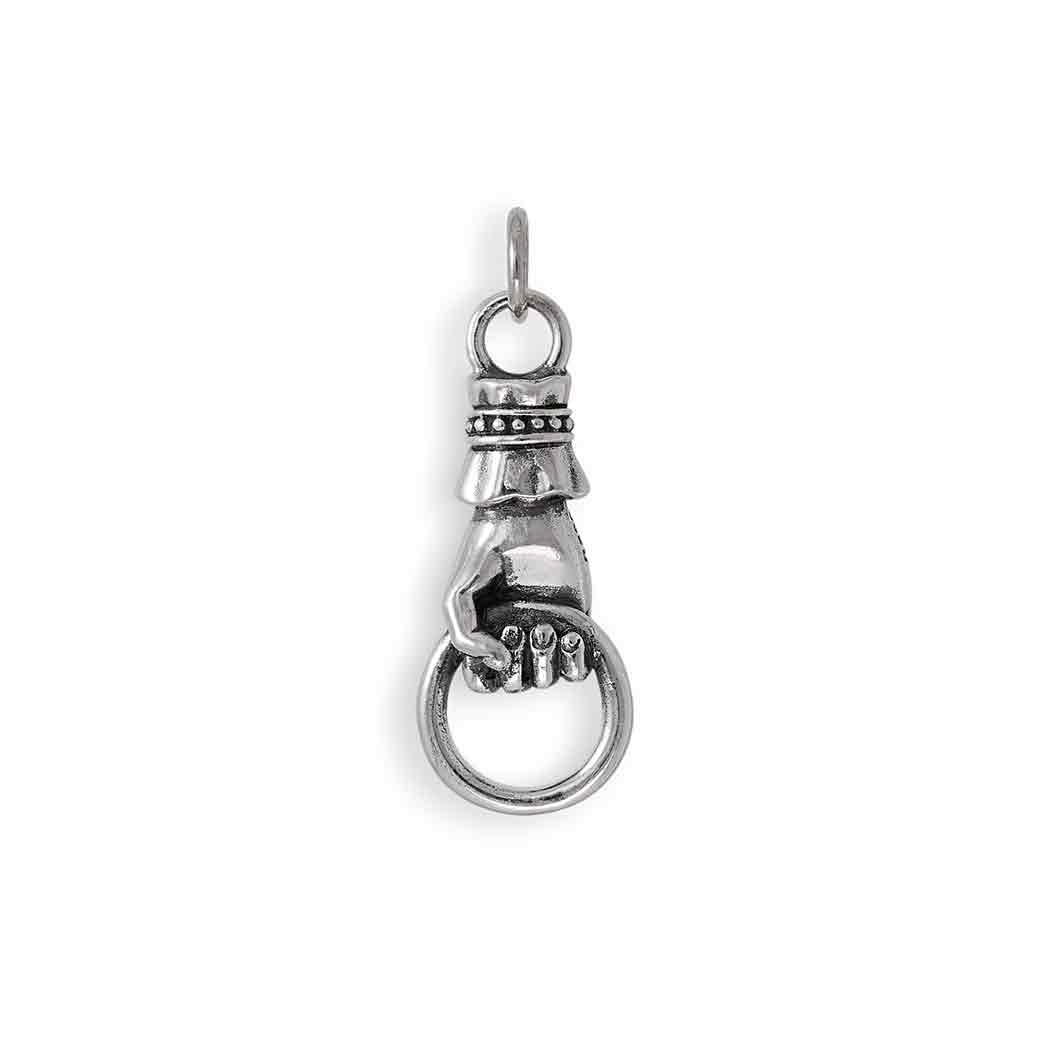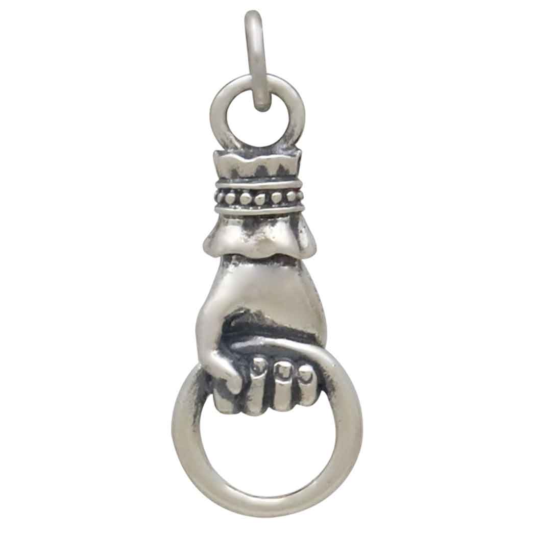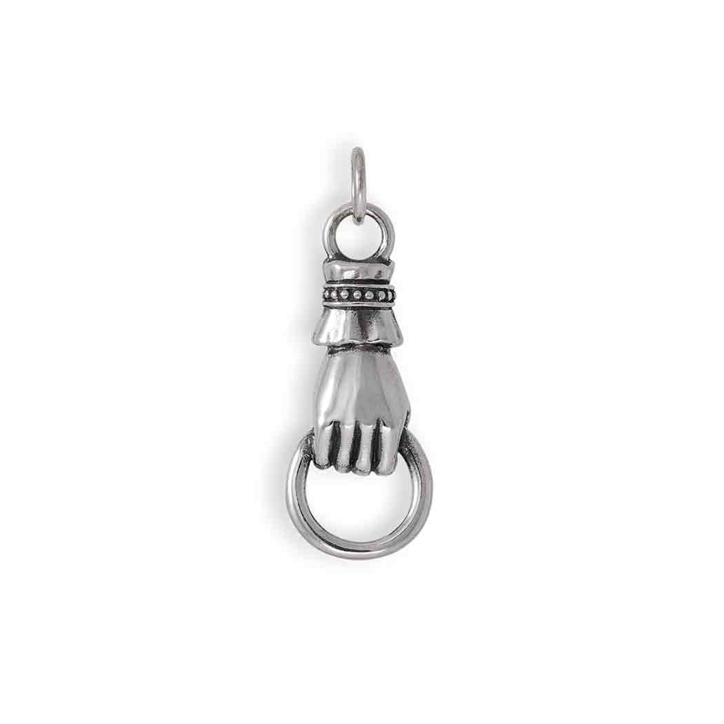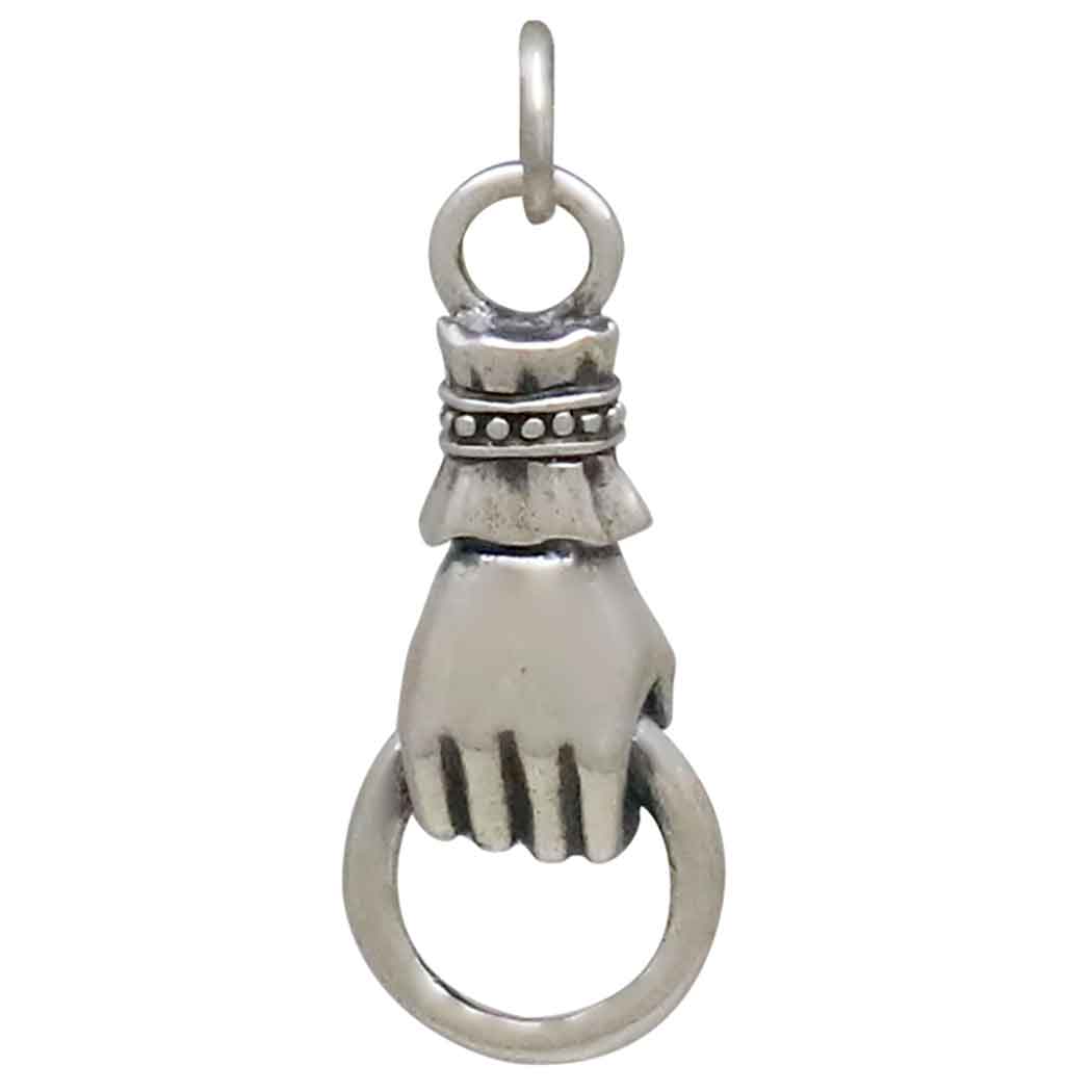 This sterling silver charm features a delicately crafted right hand holding a ring, echoing Victorian style and sophistication. The detailed design, with its elegant cuff and finely sculpted hand, is a nod to 19th-century jewelry trends, where hand motifs symbolized love, loyalty, and friendship. Often referred to as the "Hand of Friendship," this style was popular during the Victorian era as a gesture of connection and protection. This charm makes a meaningful addition to any jewelry collection, perfect for those who appreciate vintage symbolism and refined artistry.