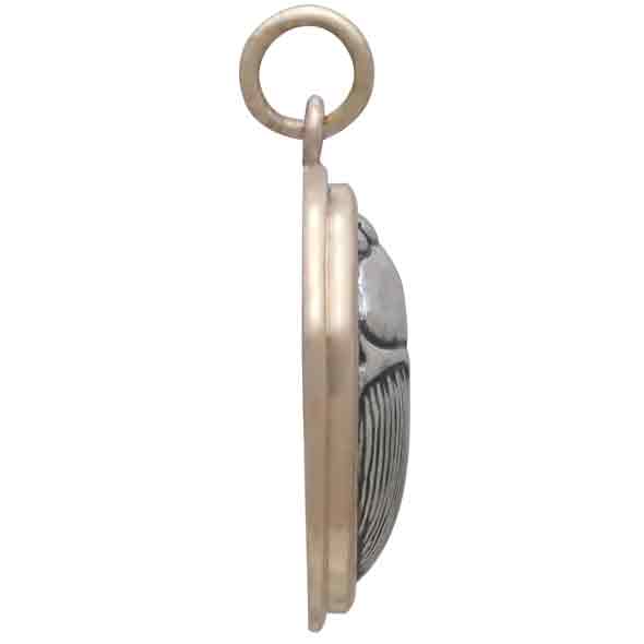 Pared down to its essential qualities and exquisitely stylized, this sterling silver scarab pendant set in bronze is a nod to the influences of both ancient Egyptian revivalism and Art Deco in jewelry design, while showcasing the beauty and symbolic power of beetles. Egyptians considered scarabs highly spiritual beings, representing creation, resurrection and immortality.