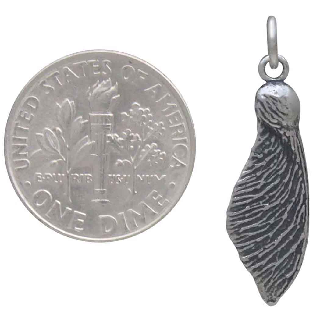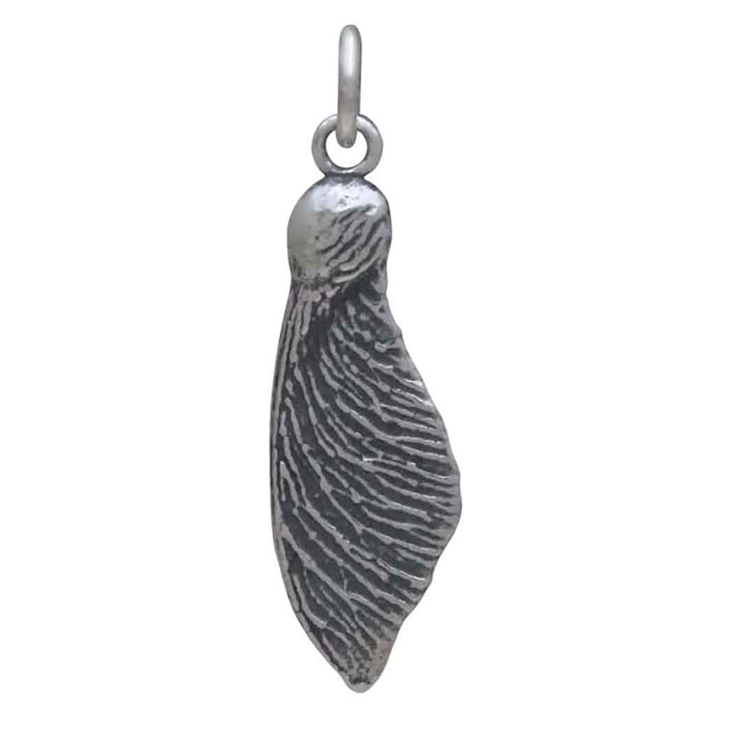 Introducing our sterling silver single maple seed pod charm, a delicate embodiment of nature's resilience. This charm captures the intricate beauty of a single maple seed pod with remarkable detail. Maple seed pods, also known as "helicopters" or "keys," contain seeds that are dispersed by the wind. This natural dispersal mechanism can symbolize the beginning of new life, growth, and fertility. Complete this silver charm into finished jewelry by stringing it onto a Finished Chain or create a personal charm cluster necklace by combining with an Initial Charm.