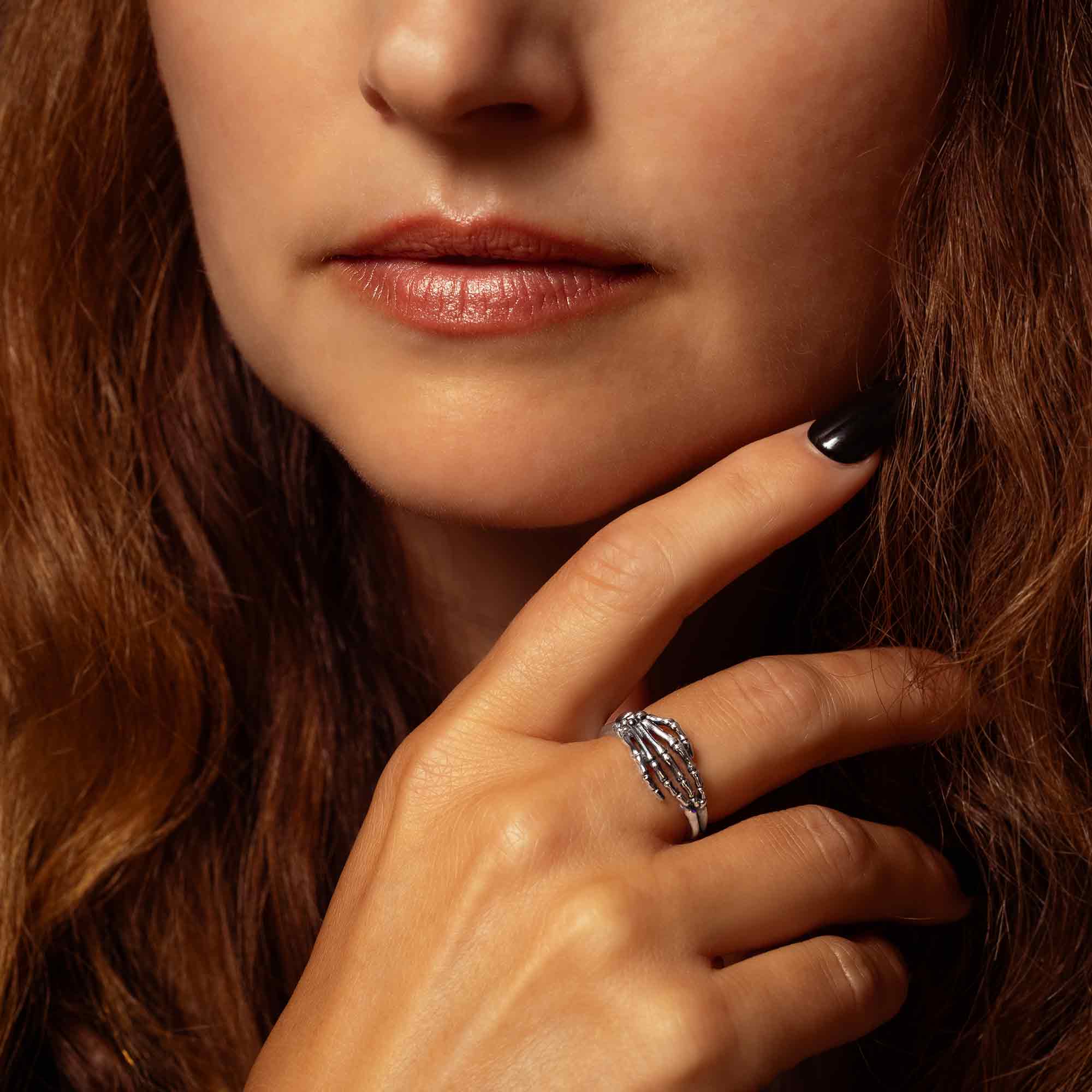 Summon a touch of the otherworldly with this sterling silver skeleton hand ring. Like a relic from a forgotten spellbook, this beautifully detailed design wraps your finger in eerie elegance—perfect for modern witches, moon gazers, and lovers of the mysterious.