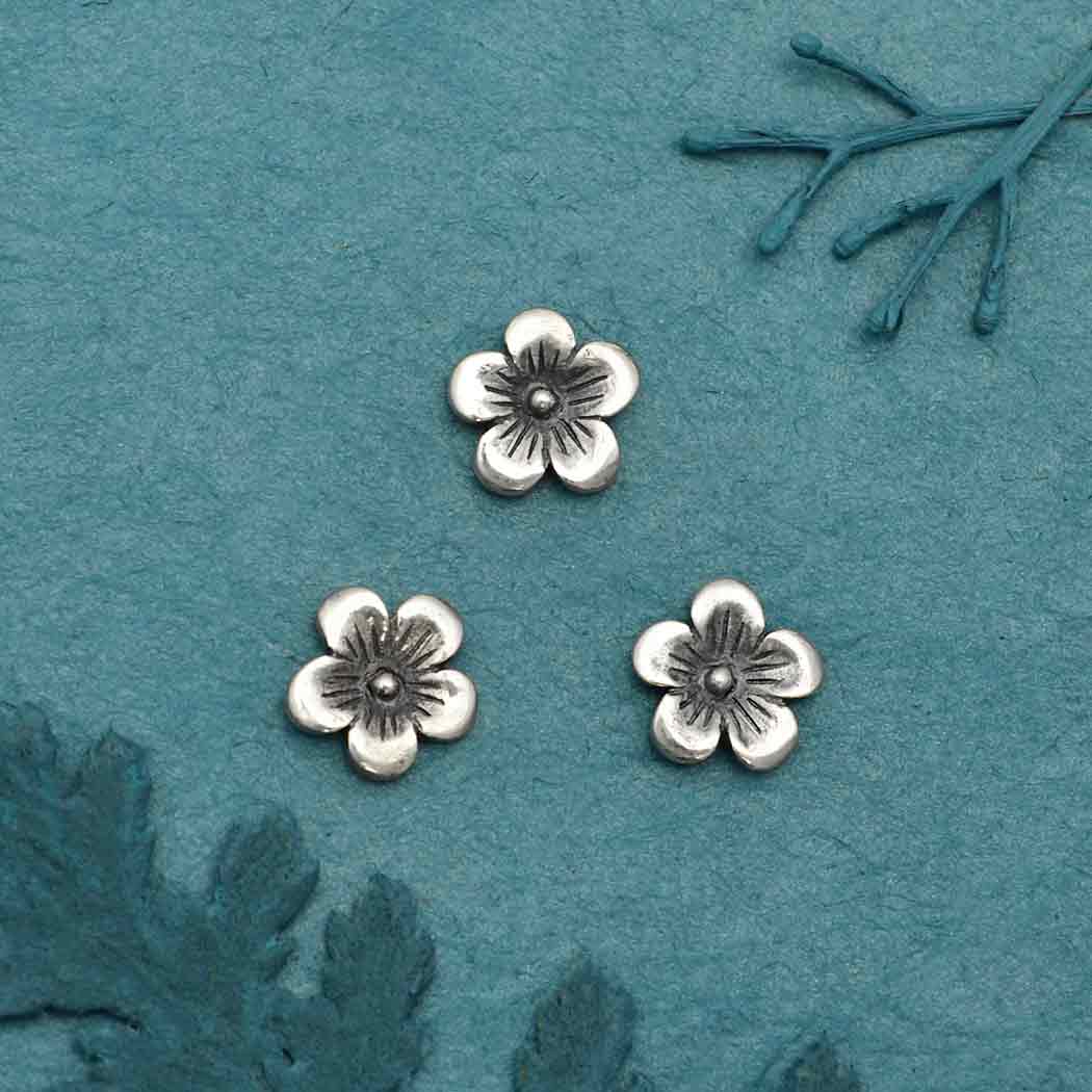 Sterling Silver Cherry Blossom Charm Embellishment. This cute Cherry Blossom Flower Jewelry Component is perfect for customizing your Jewelry Designs! This Solderable Accent does not have a jump ring, so it can be easily soldered onto a custom Jewelry Design. For thousands of years, cherry blossoms have been held in the highest esteem in Japan and China. Many artists have immortalized the cherry blossom in paintings, poetry, and embroidery. Because the blossoms last for only a short time each year, they're thought to reflect the fleeting nature of life that imbues it with a fragile beauty.