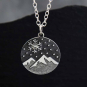 Sterling silver snowy mountain and snowflake charm necklace sets the scene for a snow-filled hike in the woods. Look up to get lost in the falling snow. Nature lovers and camping enthusiasts will be delighted with this mountain charm that zooms in on one magical snowflake..