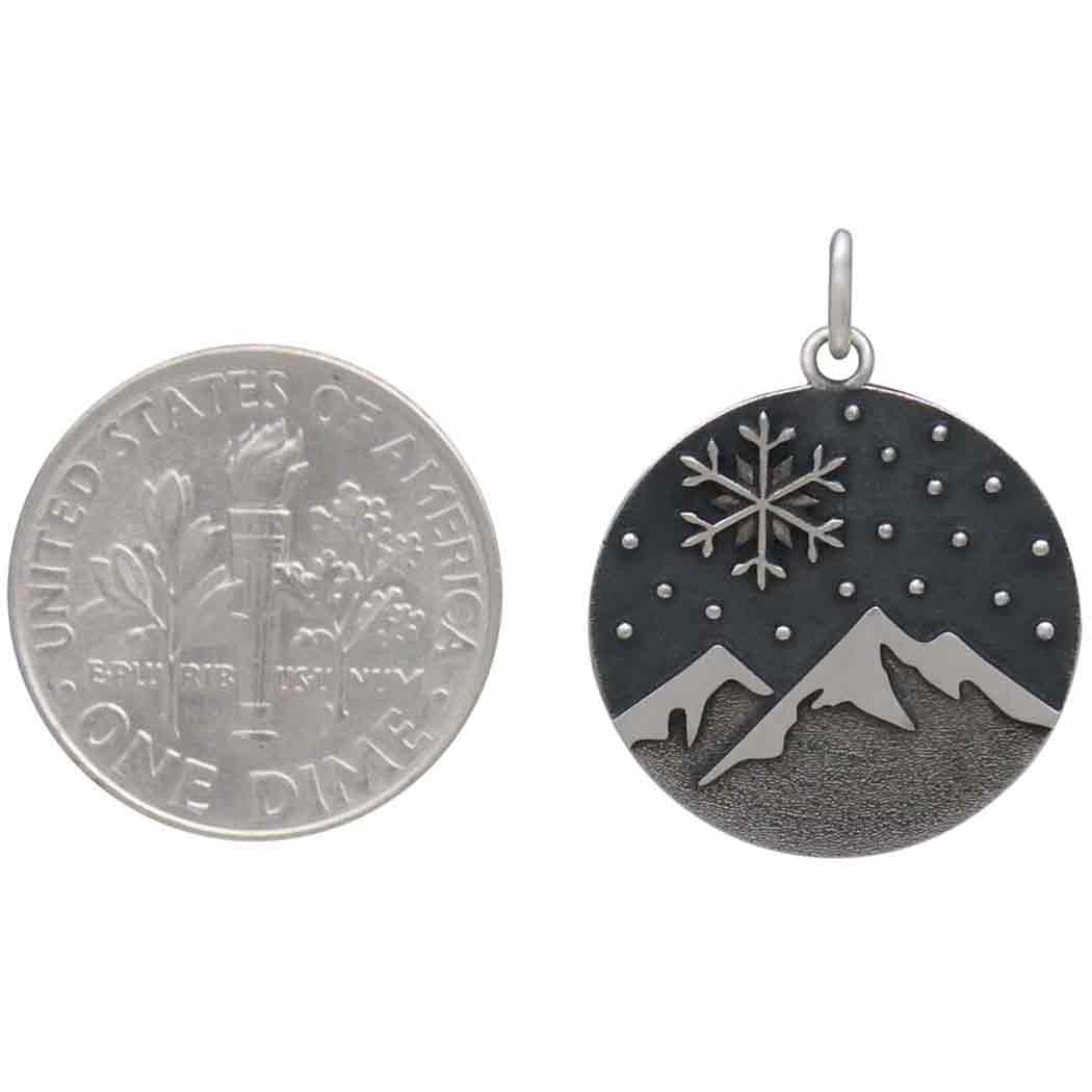 Sterling silver snowy mountain and snowflake pendant sets the scene for a snow-filled hike in the woods. Look up to get lost in the falling snow. Nature lovers and camping enthusiasts will be delighted with this mountain charm that zooms in on one magical snowflake..