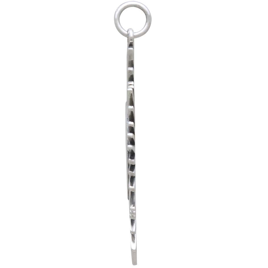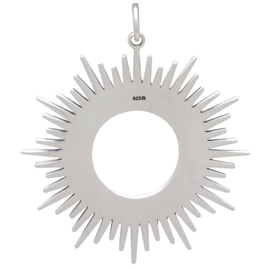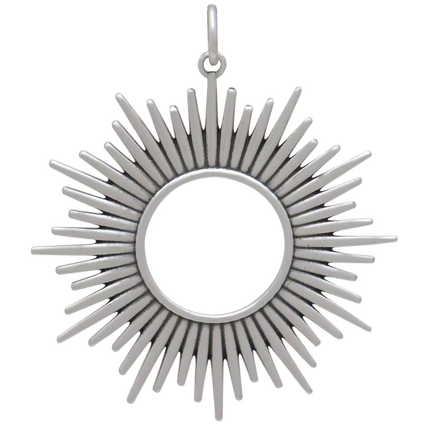 Celebrate the radiance of the sun when you wear this sterling silver sunburst spikey sun pendant. This full circle of sun rays emanates power and sheer joy. This is a fierce piece, with dramatic pointy spikes that require a bit of mindfulness when wearing it. Thread onto a finished chain for a quick necklace that celebrates the warrior within.