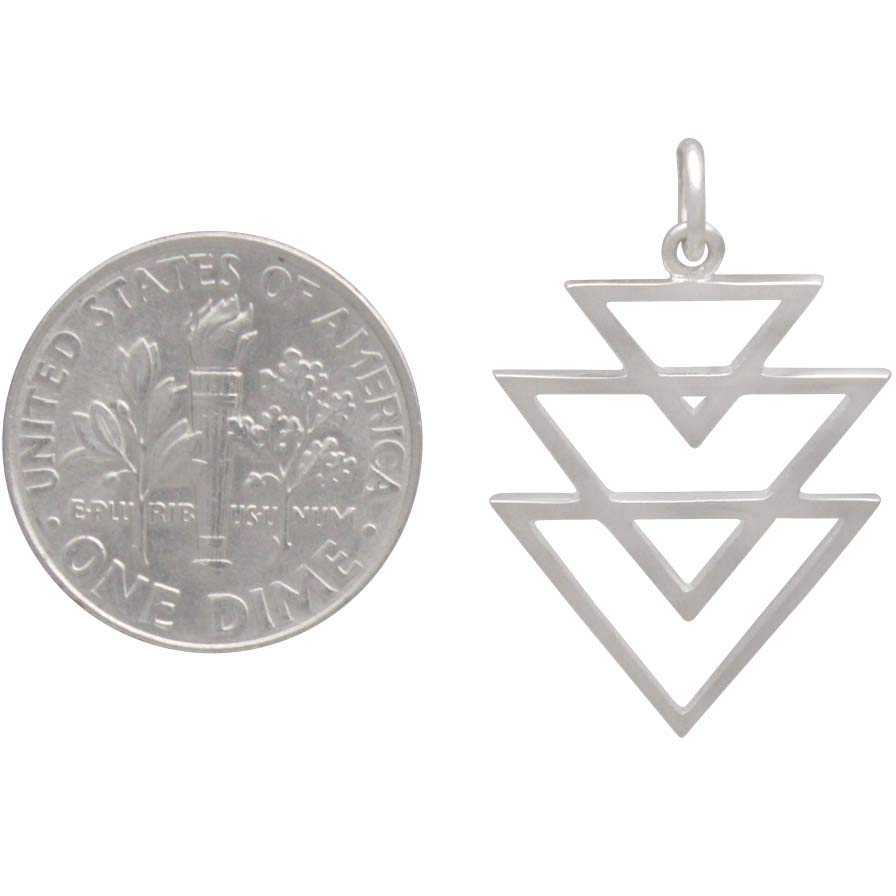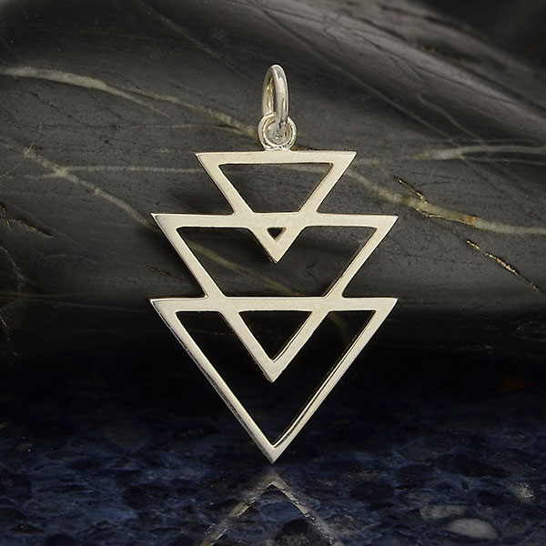 Interlocking, stacked triangles become a tantalizing pendant for making geometric jewelry. Not only do the triangles look beautiful stacked and in silver, but they offer many jewelry design possibilities. Try using in either direction, using two together for earrings, using as a link along a necklace, and combining with even more triangle charms and other geometric pendants.