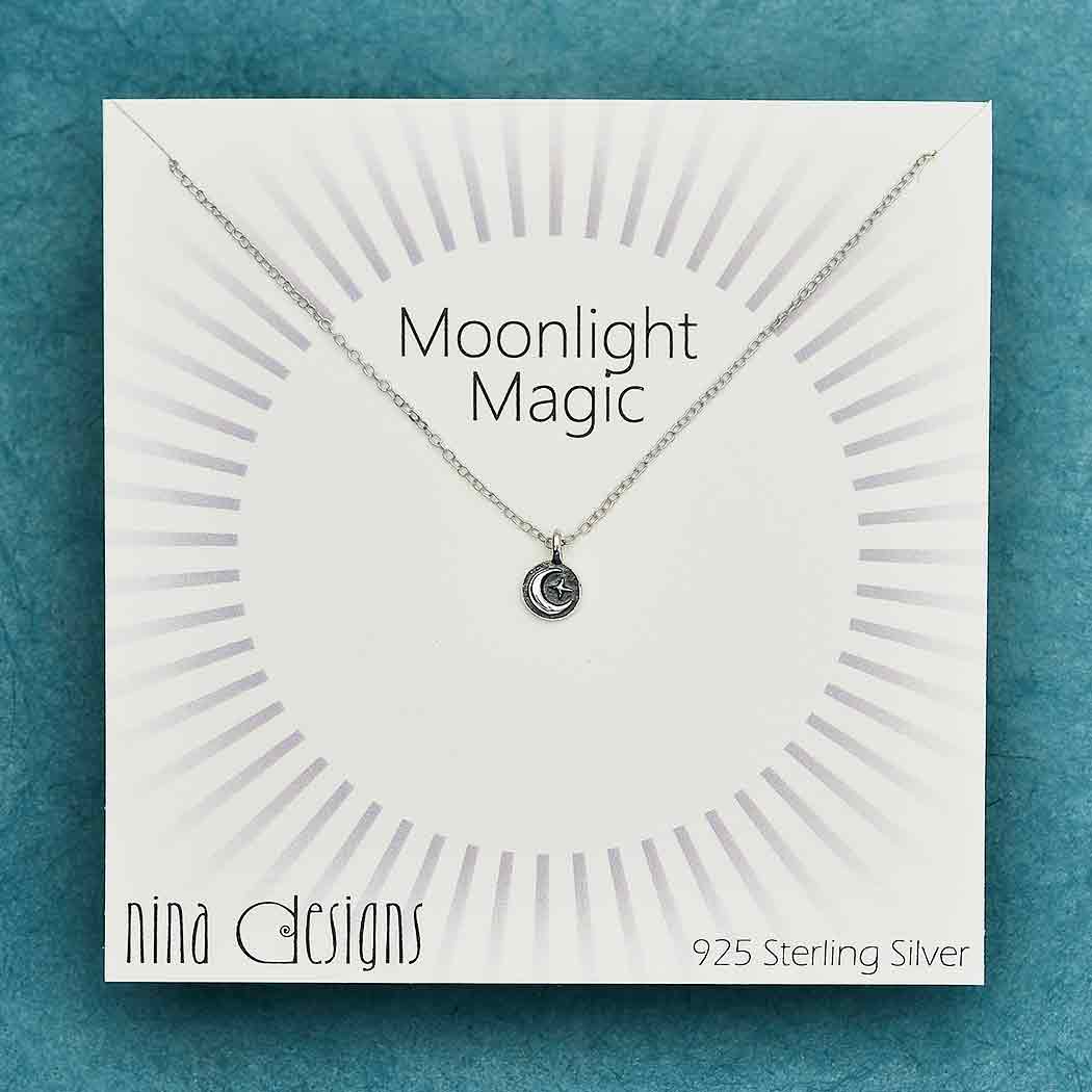 This star and moon charm necklace will arrive displayed on a 3 inch square card, printed with "Moonlight Magic," and in a cellophane bag.
