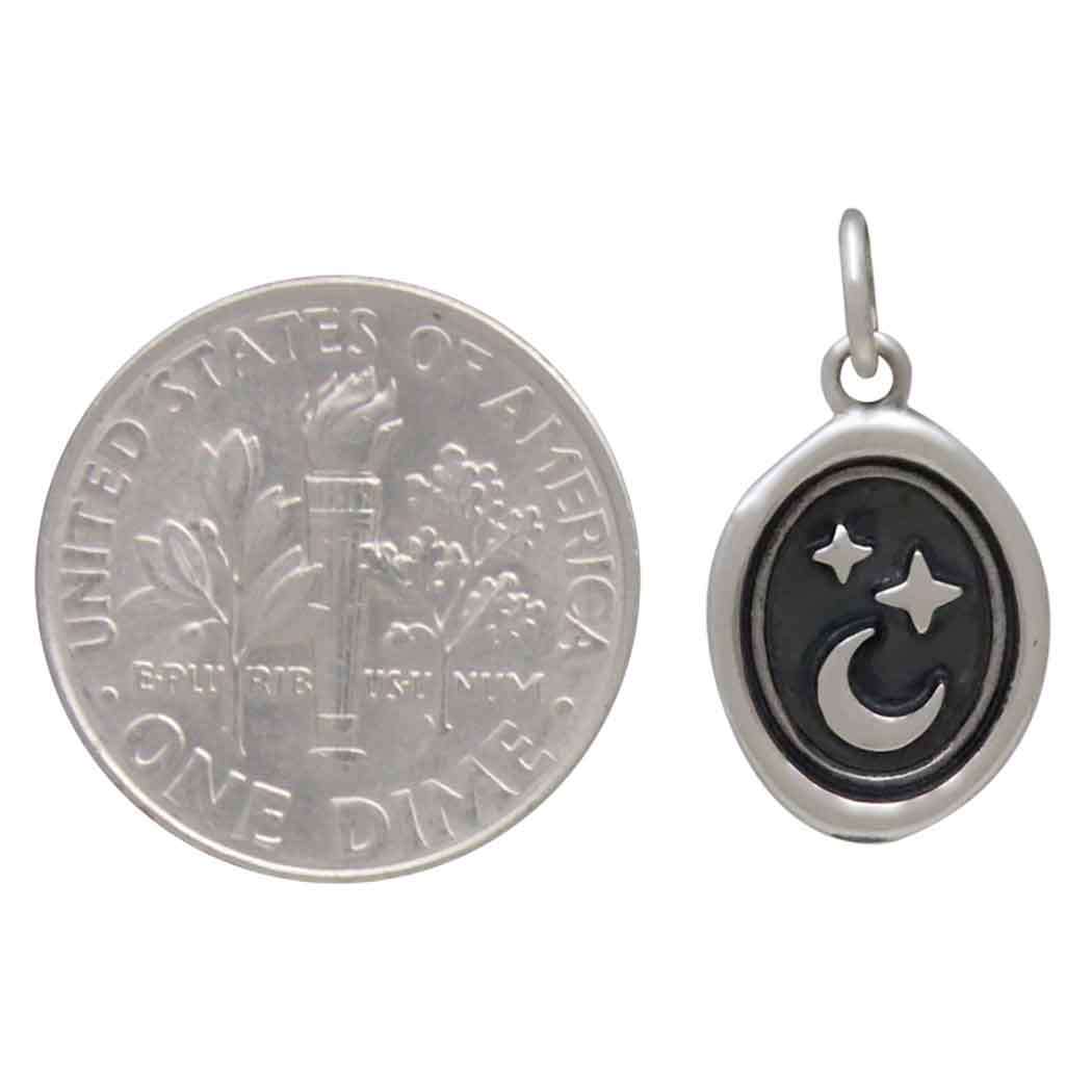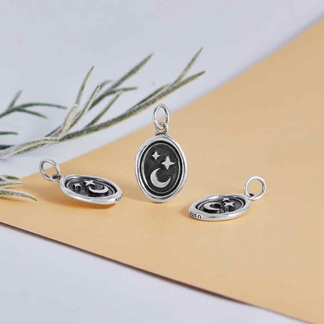 Illuminate your jewelry designs with the celestial beauty of this sterling silver wax seal star and moon charm. This charm features a graceful crescent moon nestled alongside two radiant stars. The design is framed within a vintage-inspired oval wax seal shape, offering timeless elegance and mystique. The oxidized finish highlights the textures and shapes, creating a captivating contrast that draws the eye. Symbolizing dreams, guidance, and the infinite cosmos, this charm is perfect for those who find magic and meaning in the night sky.