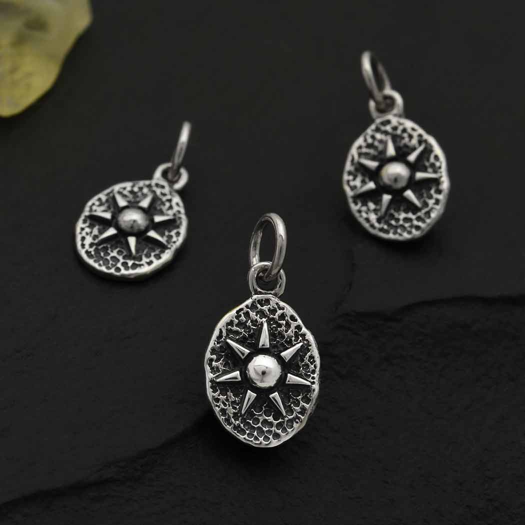 Mounted in a rustic oval, this sun symbolizes radiance, passion, creativity, and bravery. Sitting at this its center is a prominent half dome that makes this sun charm a stand-out piece. Use it when designing jewelry for Fire signs - Aries, Leos, and Saggitarians.