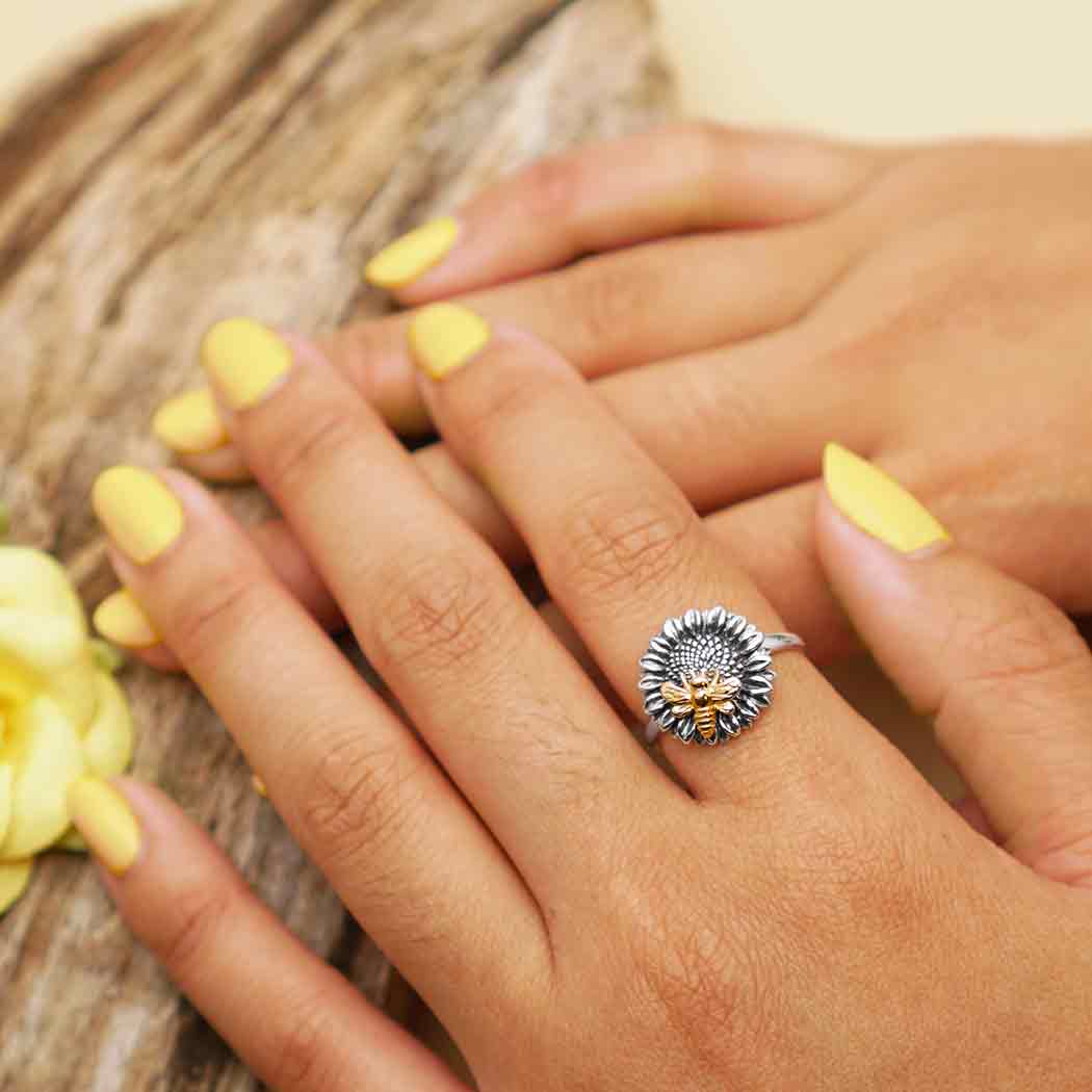 Bestow good vibes and optimism upon your customers when you offer this wonderfully detailed sterling silver sunflower ring with bronze bee in your shop. Sunflowers are top of the list for many avid gardeners, painters, and flower enthusiasts. There's no other flower that uplifts your mood, and symbolizes loyalty and friendship better than the sunflower.