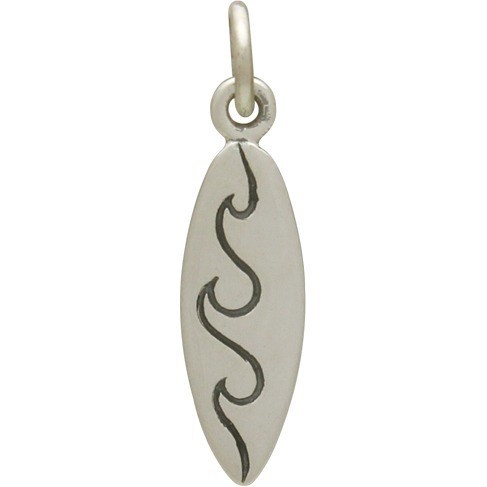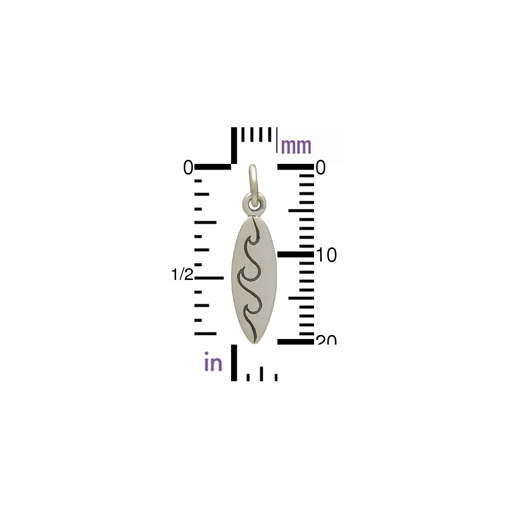Sterling Silver Surfboard Charm. Surfs up! This adorable and realistic surfboard charm is sure to make you think of catching waves with friends at the beach. The charm features both front and back details, making it all the more cute. The perfect gift for a beach bum!