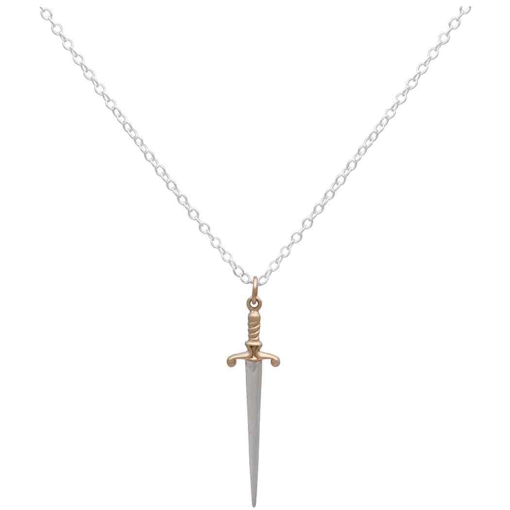 Sterling silver sword necklace with a bronze handle brings bold symbolism to wholesale necklaces and meaningful jewelry displays. Fine detailing from point to pommel gives this pendant the look of a true medieval sword. Swords are one of the earliest weapons found in cultures the world over, and as such are saturated with cherished meaning and symbolism. Swords can connote power, protection, chivalry, truth, enlightenment, action, and justice. In Christian thought it primarily represents righteousness, while in Congo tribes of Central Africa swords are symbols of transition, especially between life and death. In tarot, swords can also speak to thought, discernment, and the realm of the mind.