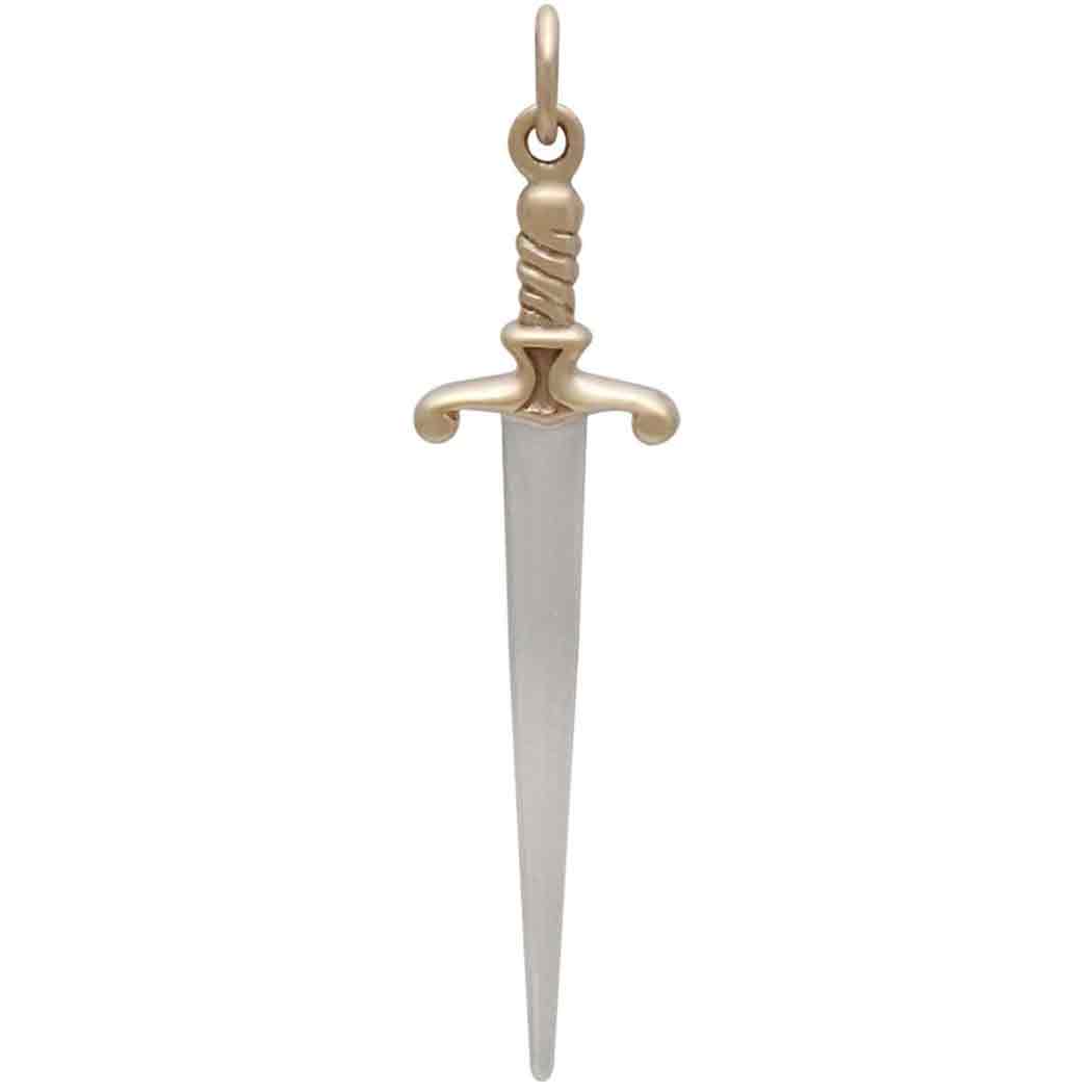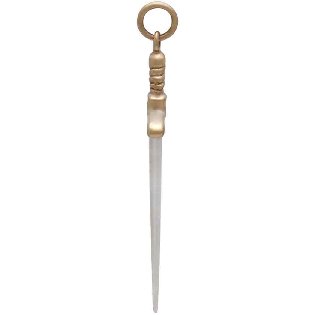 All parts of this sterling silver sword pendant with bronze handle are wonderfully detailed. From the point to the pommel, this sword charm looks like a miniature of an actual Medieval sword. The pronounced quillion and the twisted grip are especially fierce! Swords are one of the earliest weapons found in cultures the world over, and as such are saturated with cherished meaning and symbolism. Swords can connote power, protection, chivalry, truth, enlightenment, action, and justice. In Christian thought it primarily represents righteousness, while in Congo tribes of Central Africa swords are symbols of transition, especially between life and death. In the symbolic language of tarot, swords represent the realm of the mind, specifically the navigation of thought.