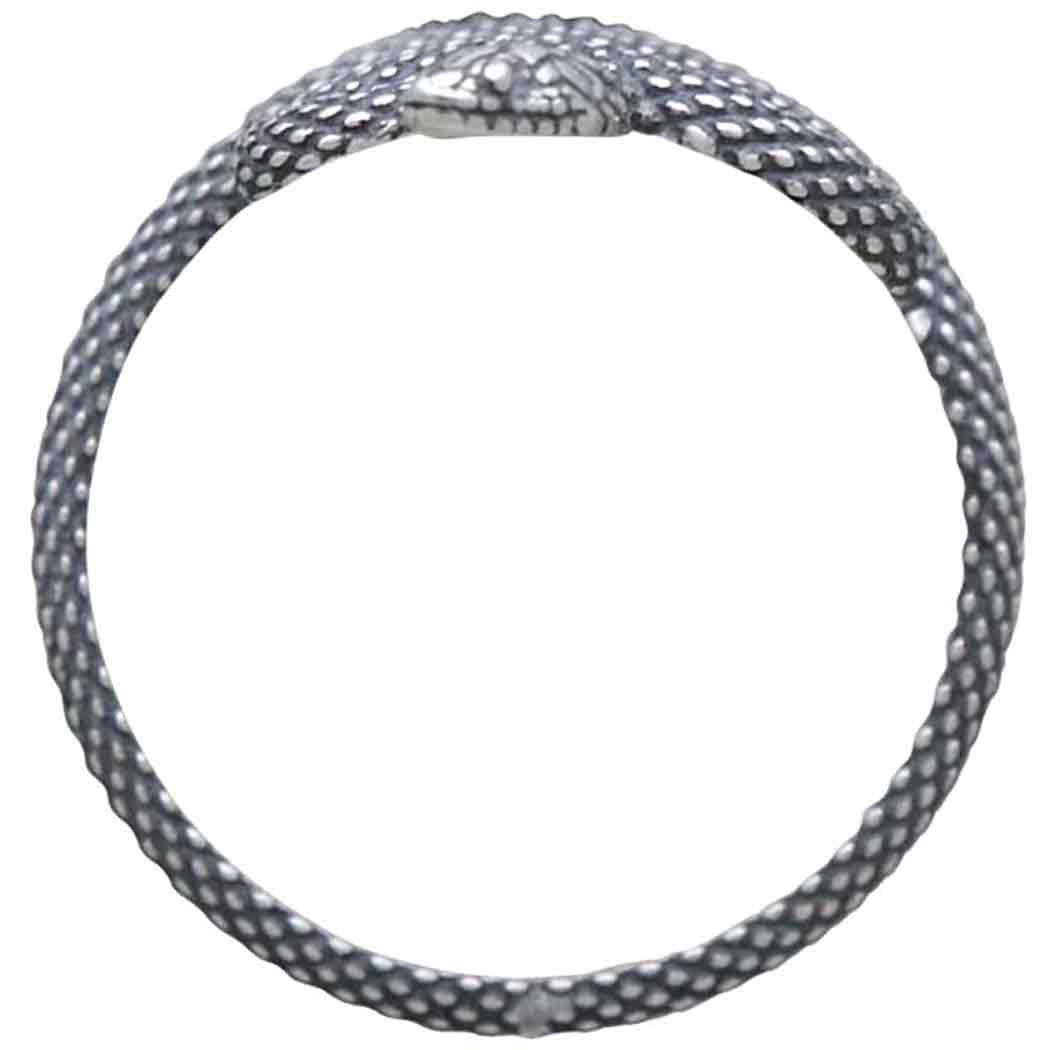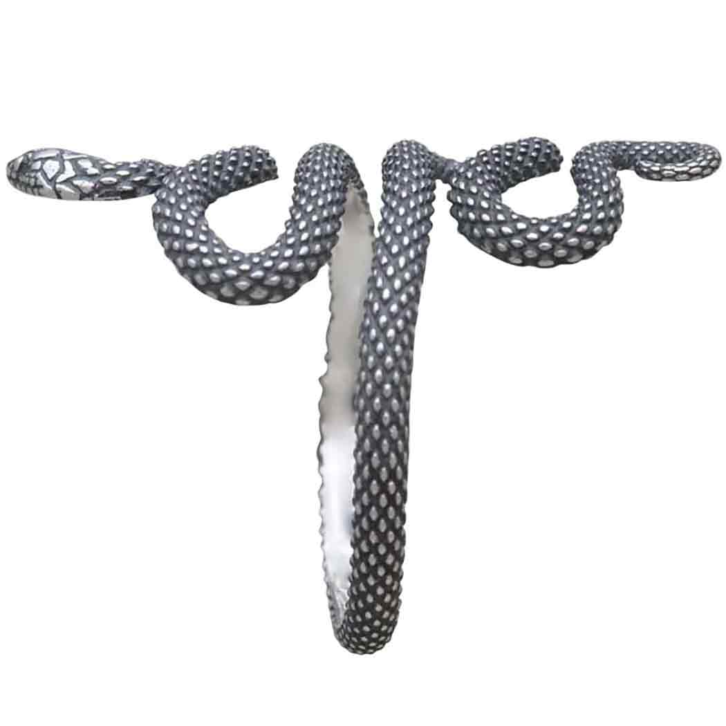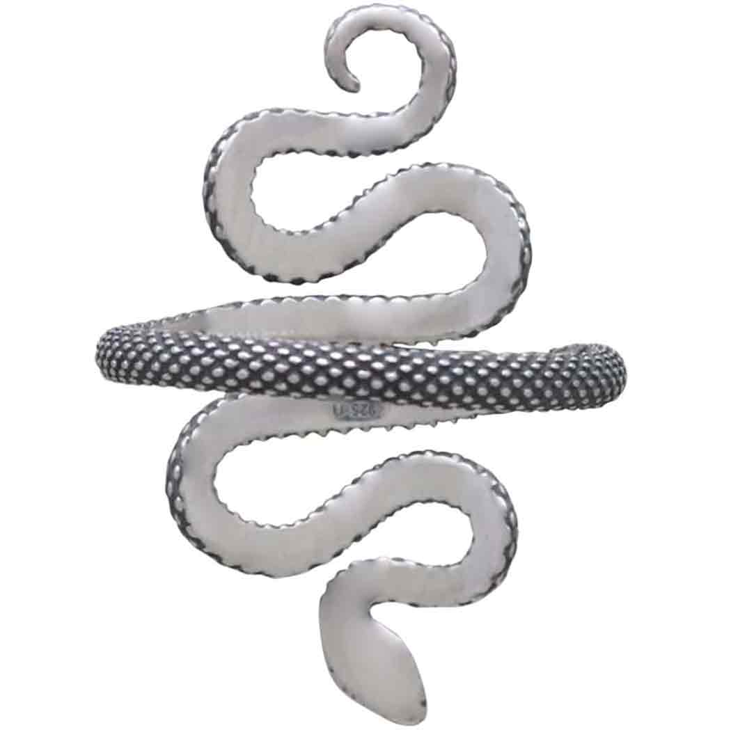 Mesmerize your customers with this sterling silver textured adjustable snake ring. Coiled into hypnotic waves and rendered with lifelike texture, this dark beauty is ready to strike. Welcome this serpent into your jewelry line as ring of protection. Snakes are protectors of the shadow realms & portals between worlds. Nothing conveys the neverending cycle of life, death, and rebirth more poetically than the serpent.