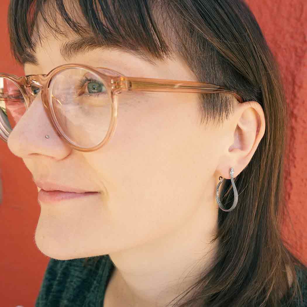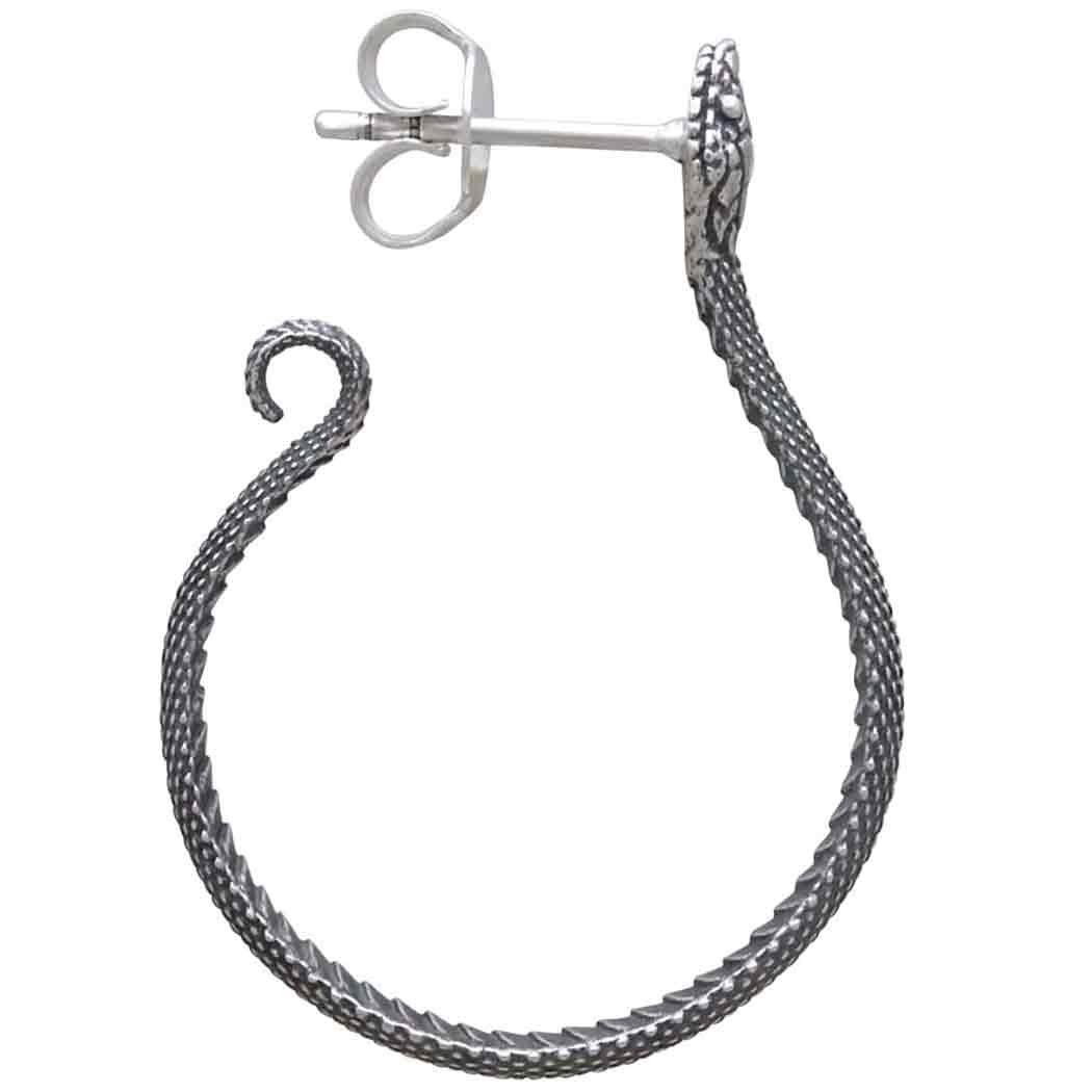 Mesmerize your customers with these sterling silver textured snake hoop earrings. These large generously sized serpent hoops are rendered with lifelike details on both the outside and insides of hoop.