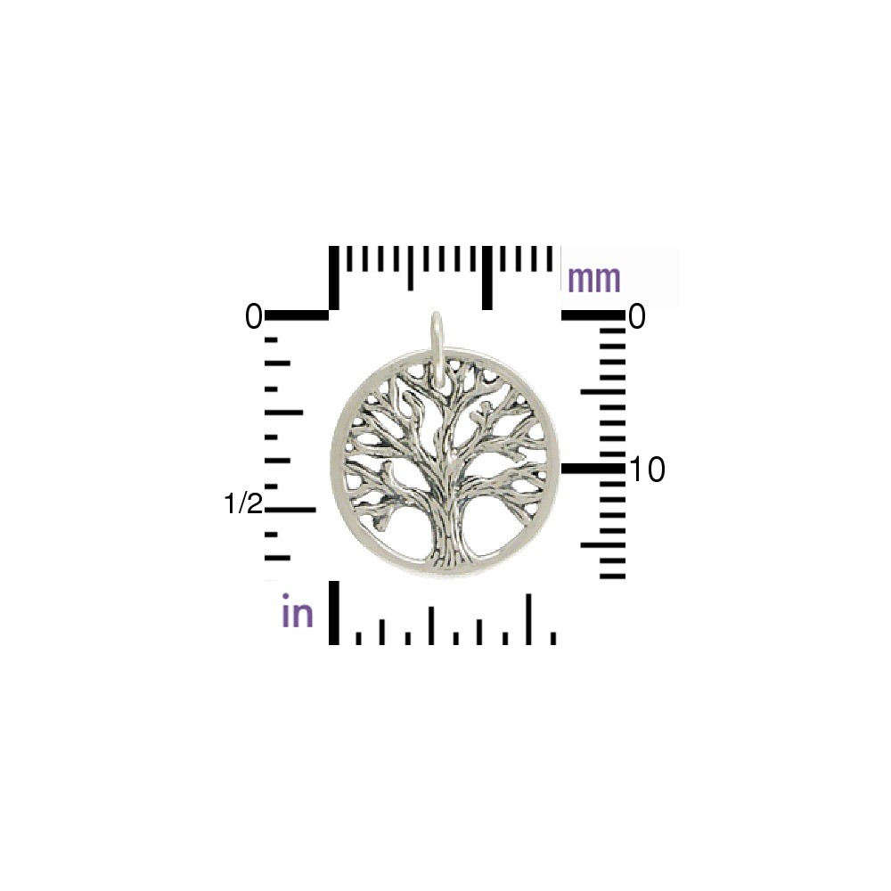 Small Sterling Silver Round Charm with Textured Tree. Trees embody many mythic qualities. The deep-rooted meaning of trees is apparent in common metaphors such as the Tree of Life and family trees. In Hindu philosophy, wood is viewed as the primal material of the universe. Christians see Christ as the cosmic carpenter and His ultimate sacrifice is represented by a wooden cross. Shop all tree of life charms!