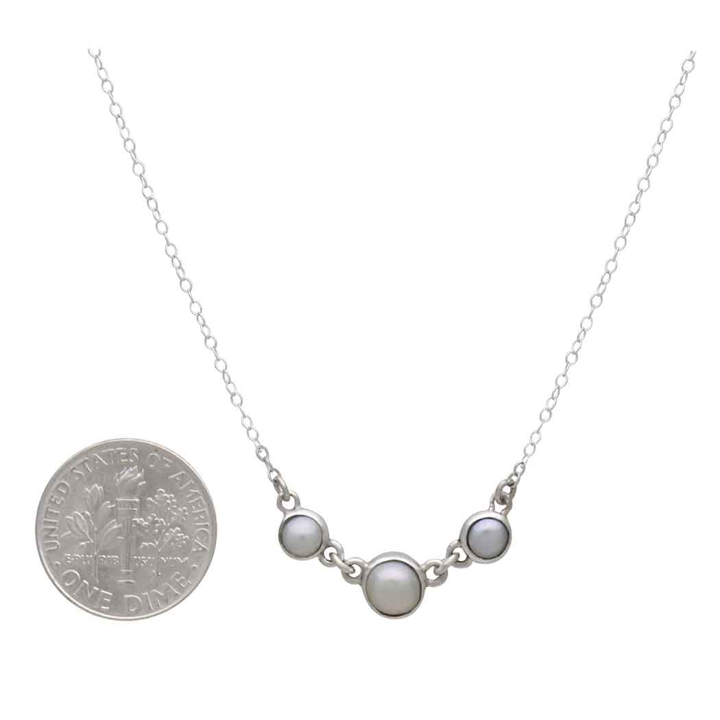 Elevate your elegance with our Sterling Silver Three Pearl Festoon Necklace. This necklace features a delicate chain adorned with a trio of lustrous pearls in a graceful festoon design. The central pearl, slightly larger, creates an elegant gradient that draws the eye. Each pearl is securely held in place, allowing their natural beauty to shine. Whether you’re attending a special occasion or adding sophistication to your everyday look, this necklace is a timeless choice.