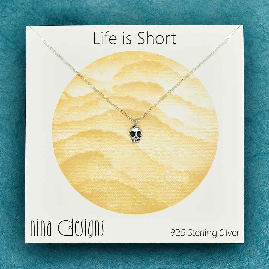 This tiny skull necklace will arrive displayed on a 3 inch square card, printed with "Life is Short" and in a cellophane bag.