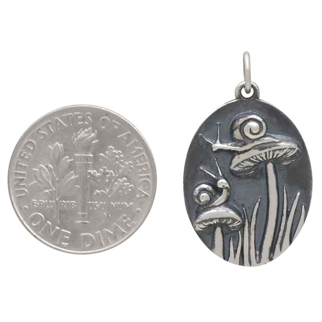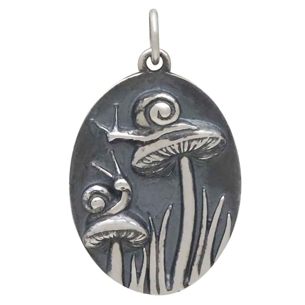 This sterling silver two mushroom charm with snails is too cute for words. It features two perky mushrooms with detailed gills topped with two curious, slightly shy gastropod. Both snails and mushrooms appeal to sensitive souls who relish an imaginative life spent reading, gardening, and making all manner of things. Offer this charm to all the daydreamers in your customer base. Add to finished chain for a sweet snail charm necklace. Find more Animal Charms and Bug Charms too.
