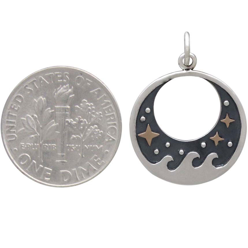 Make a scene with this sterling silver wave charm with bronze stars. The high drama comes from the contrast of mixed metals and however you decide to complete the tableau. Will you drop a white coin pearl to call on the power of the moon? Or, perhaps a stormy blue gemstone to showcase the ocean's powerful draw?