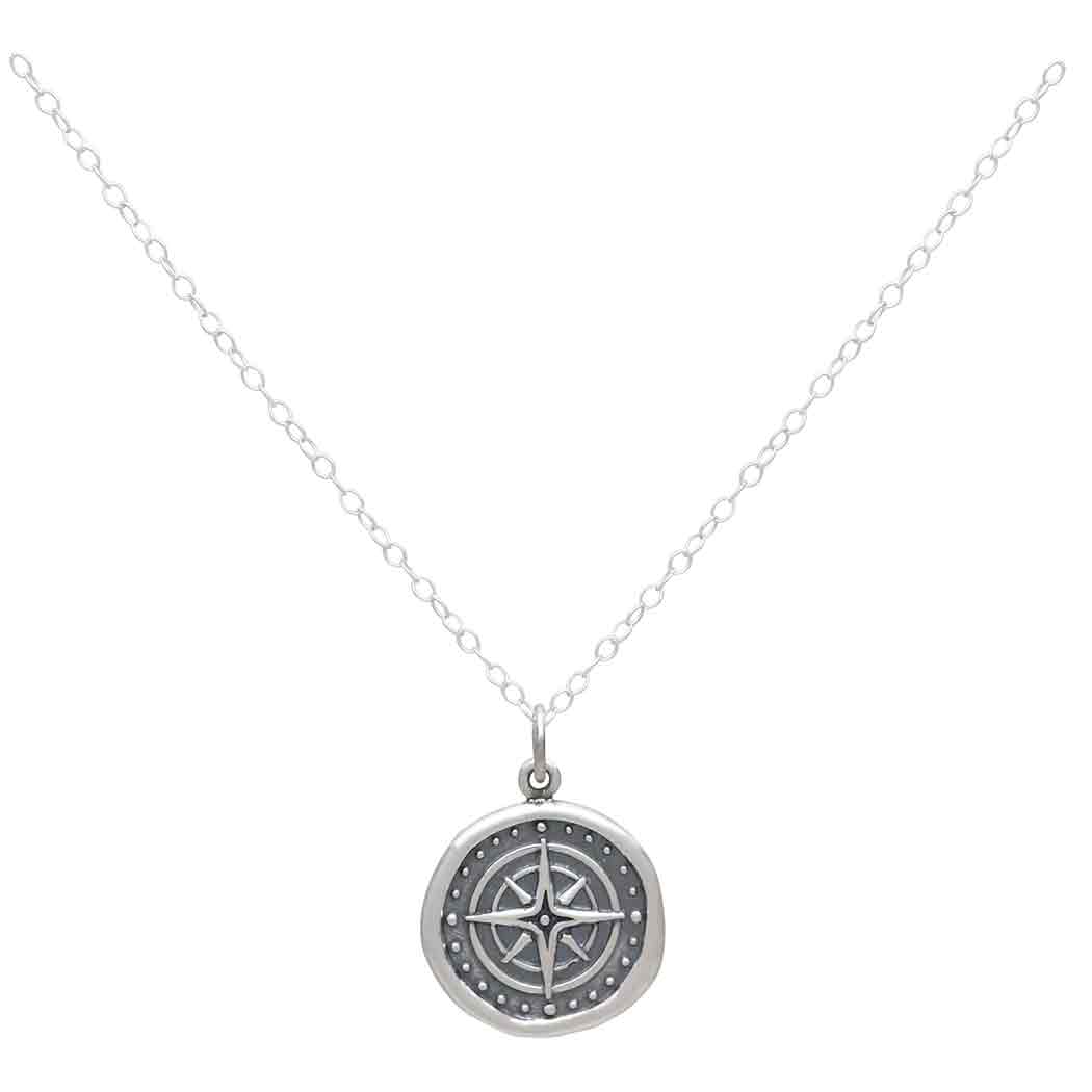 This sterling silver wax seal compass necklace is full of symbolism and meaning. Because compasses are instruments used to guide explorers on expeditions and always points north, they've come to stand for guidance, inspiration, hope, motivation, and finding your way home. Compass charm necklaces make thoughtful gifts for friends and family embarking on new journeys marked by graduations, weddings, and good byes. Find more Finished Charm Necklaces for the many occasions your customers look to your shop for meaningful gifts.