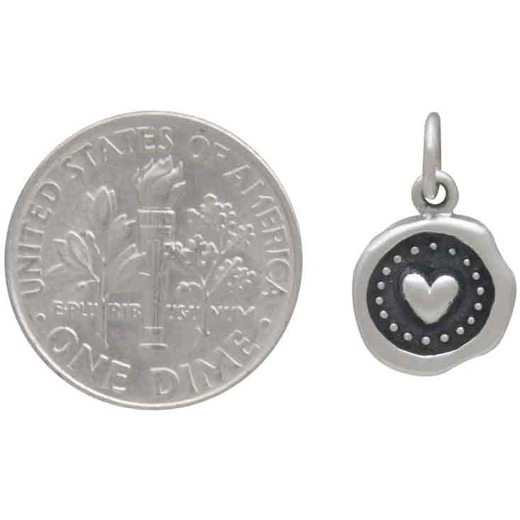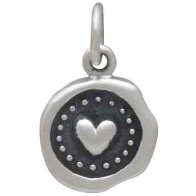 This sterling silver wax seal heart charm carries the tactile, antique-inspired aesthetic of a letter seal pressed into wax, with a plump, dimensional heart at its center. The irregular edges and ring of tiny dots give it an artisan quality that sets it apart from a simple flat heart charm. Handcrafted in Bali, this wholesale sterling silver charm draws on centuries of meaning: hearts have been recognized across cultures as symbols of love, joy, charity, and compassion. Medieval alchemists used the heart symbol in incantations for love and romance, deepening its association with emotional bonds and devoted intention. It pairs naturally within the wax seal series alongside the Sterling Silver Laurel Wreath Wax Seal Charm, whose symbolism of honor and celebration complements the heart's themes of love and connection beautifully.