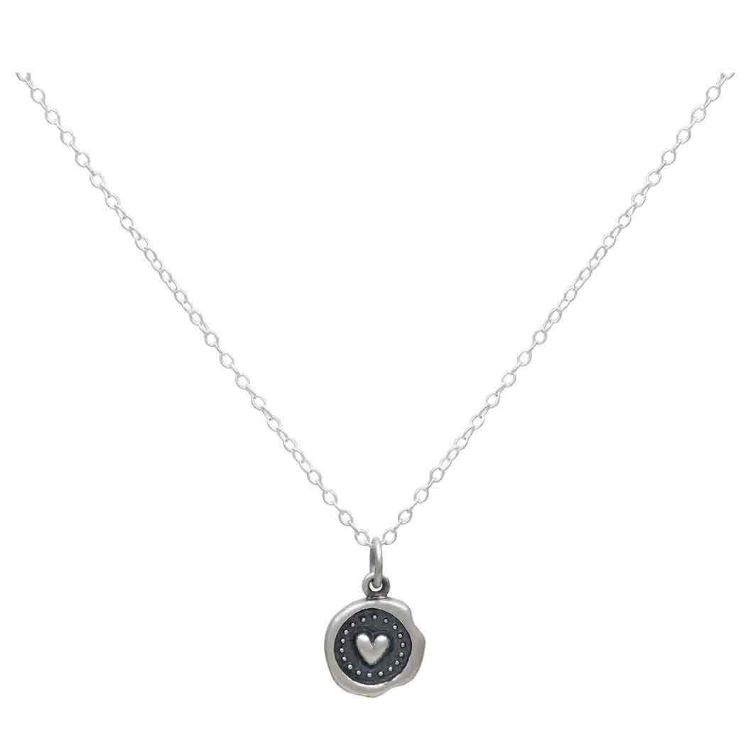 Spark joy and romance with this sterling silver wax seal heart necklace. The details on this chubby heart charm, like the irregular edges and the circle of tiny dots, add to its appeal. Hearts are recognized across cultures as being a symbol of love, charity, joy and compassion. In times past, alchemists used heart symbols for incantations pertaining to love and romance, attempting to strengthen relationships.