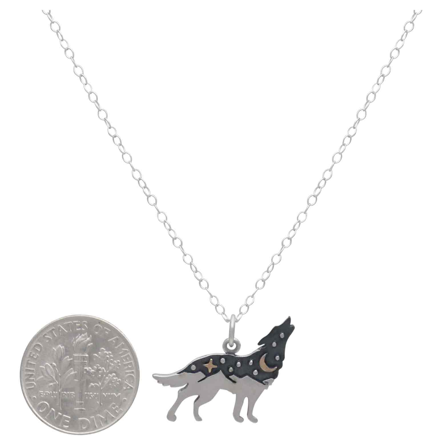 Sterling silver wolf necklace with bronze star and moon enchants with its magical, mystical dreamscape - transporting you to an unfamiliar place of trance walking and ritual dances. Because of their fierce spirit & success as hunters, wolves are about survival and loyalty to their pack. Every wolf instinctually does its part to help the whole.